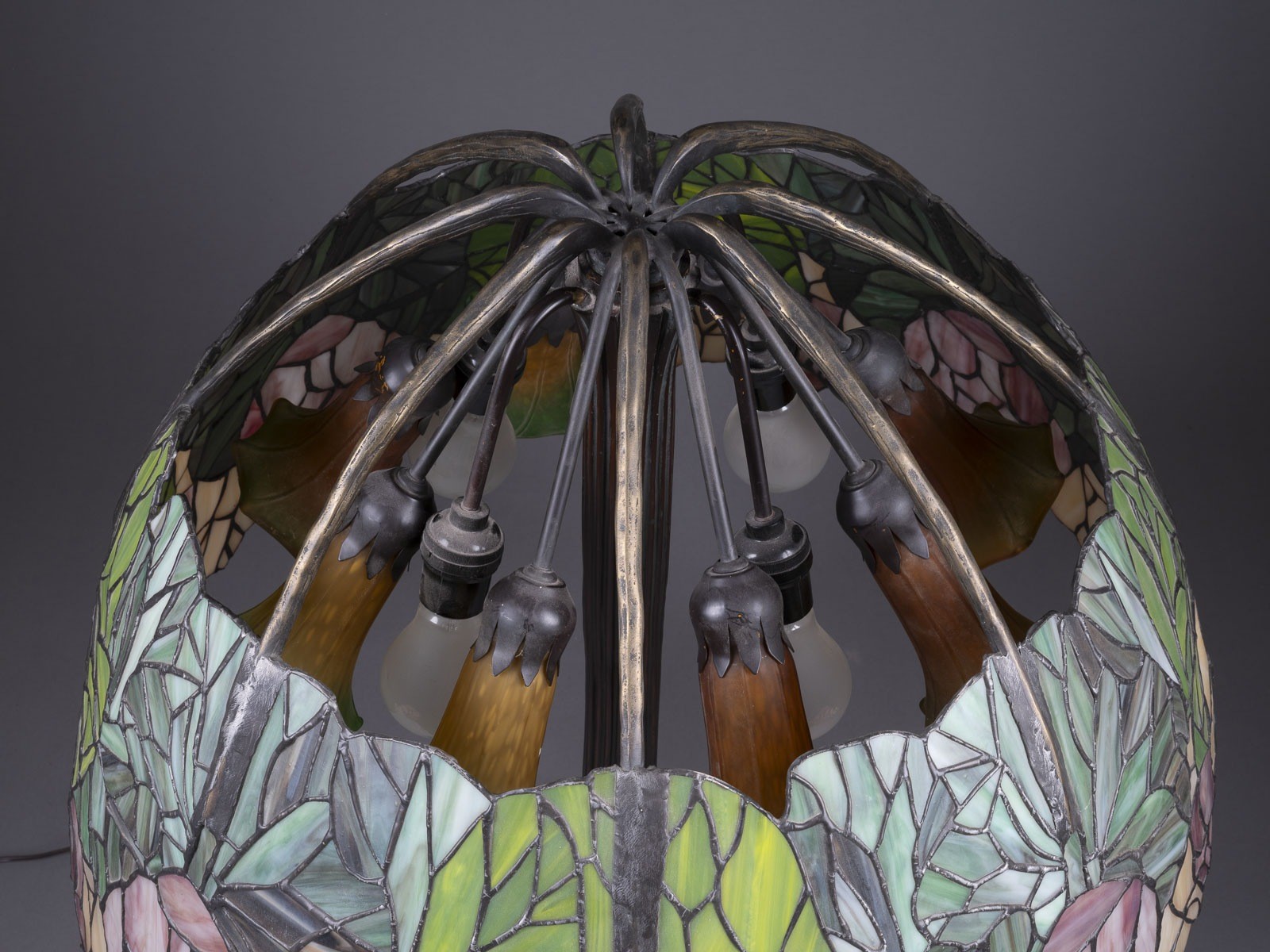 Schirm außen m. polychromem Glasdekor in Tiffany-Technik, innen acht Montierungen f. mundgeblasene, blütenkelchartige Schirme. H. ca. 83 cm, D. 65 cm (Schirm). Ritzsignatur bez. 'LC Tiffany-STUDIO'. Konstruktion teilw. Messing, Bronzefuß m. eingelegtem, vegetabilem Glasmosaik und vier zusätzlichen Lampenfassungen. Insgesamt 12-flg. elektrifiziert, Funktion ungeprüft.