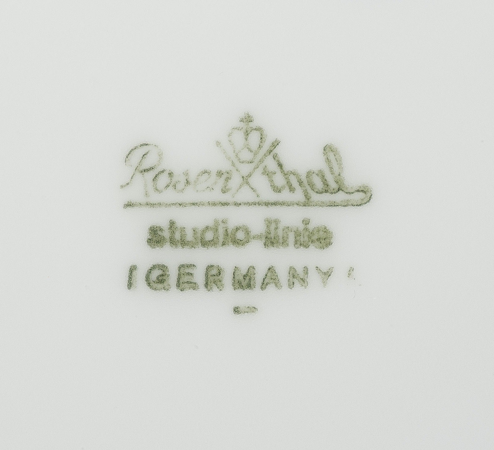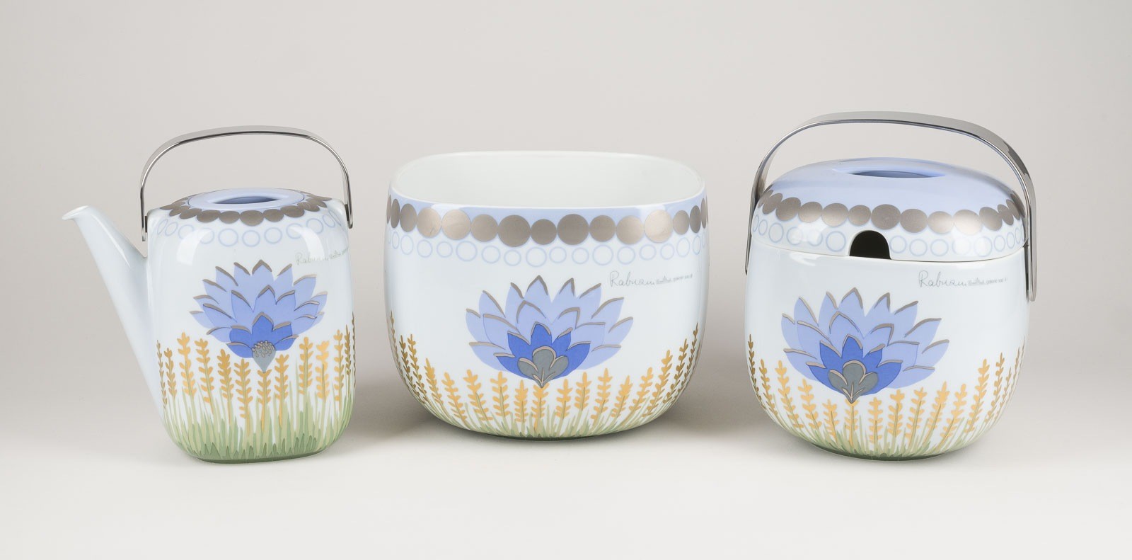 IVAN RABUZIN 1919 Kljuc - 2008 Varazdin 3-PIECE PORCELAIN 'SUOMI' Germany, Rosenthal AG, pattern designed circa 1976 White glazed porcelain, polychrome overglaze overglaze decoration, chrome-plated brass handles. H. max. 20,5 cm (jug), W. max. 21 cm, D. max. 21 cm (bowl). Marked underneath ' Rosenthal studio-linie GERMANY' (underglaze green), marked 'Rabuzin Rosenthal galerie 500/18, 500/163 u. 500/81' on the outside. Shape designed in 1976 by Timo Sarpaneva. Traces of use, tureen with hairline crack.