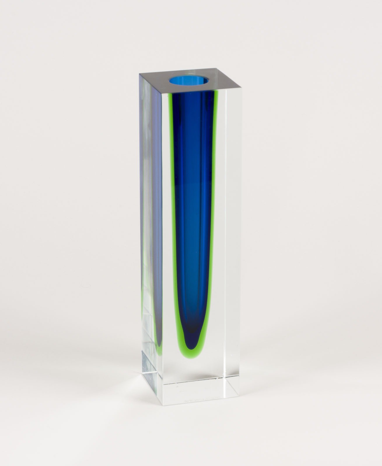 JAN BERÁNEK 1933 Polevsko bei Nový Bor 'SOMMERSO' BLOCK VASE CSSR, Skrdlovice Sklo, around 1960/70 Blue and green glass, thick colourless overlay, cut, polished. H. 26 cm , W. 6,5 cm, D. 6,5 cm. Maerked underneath 'BERÁNEK' (incised).