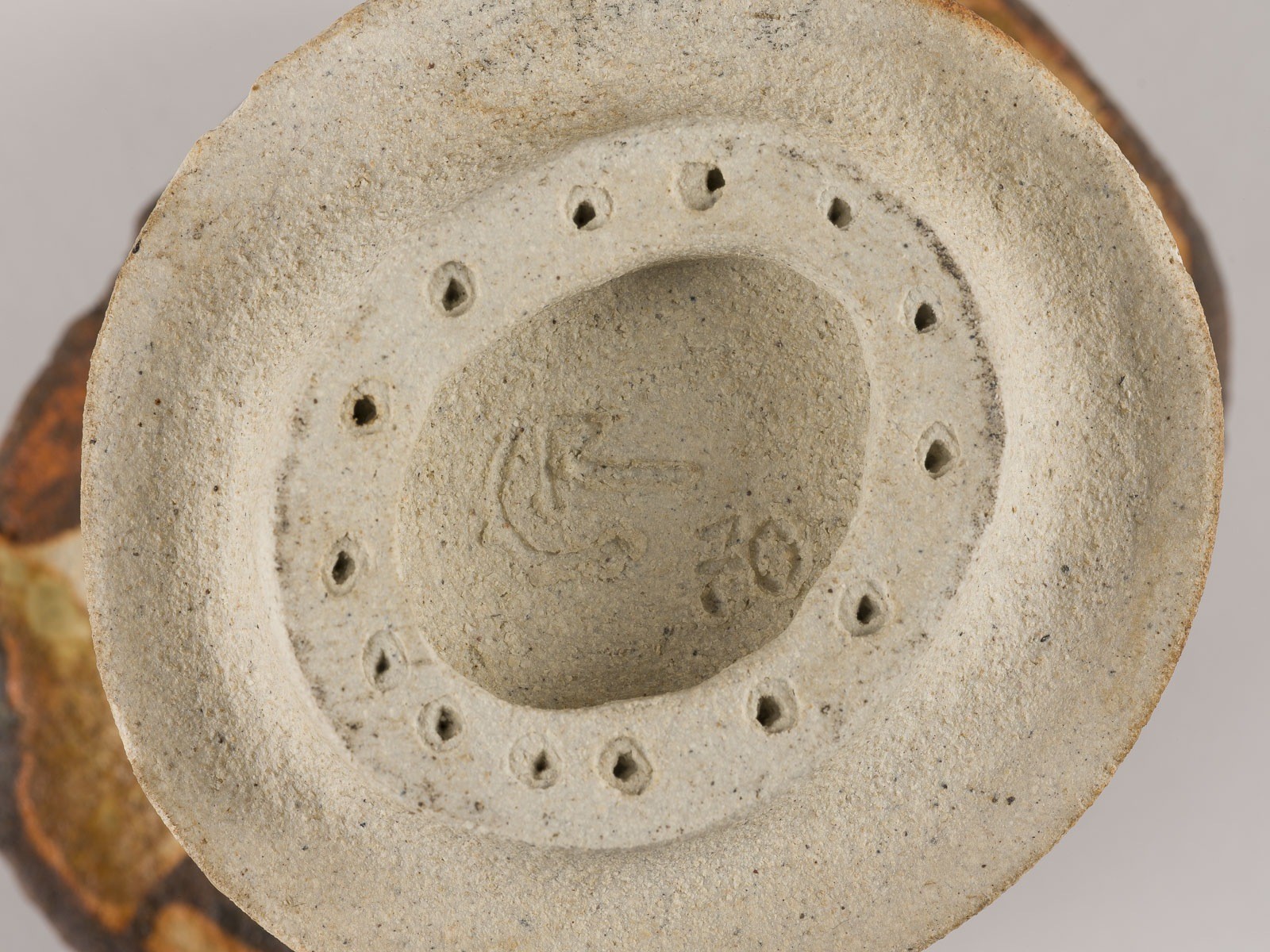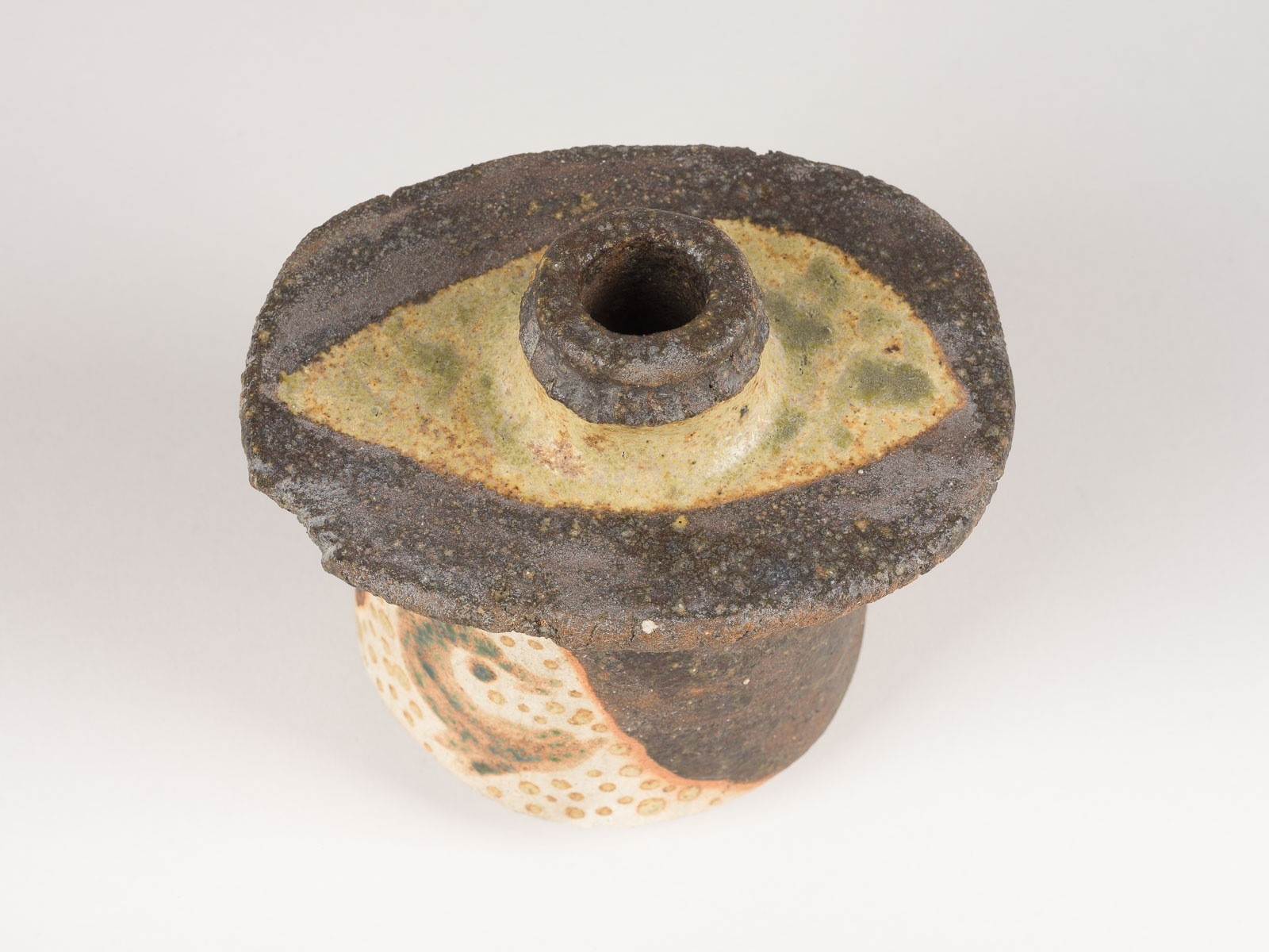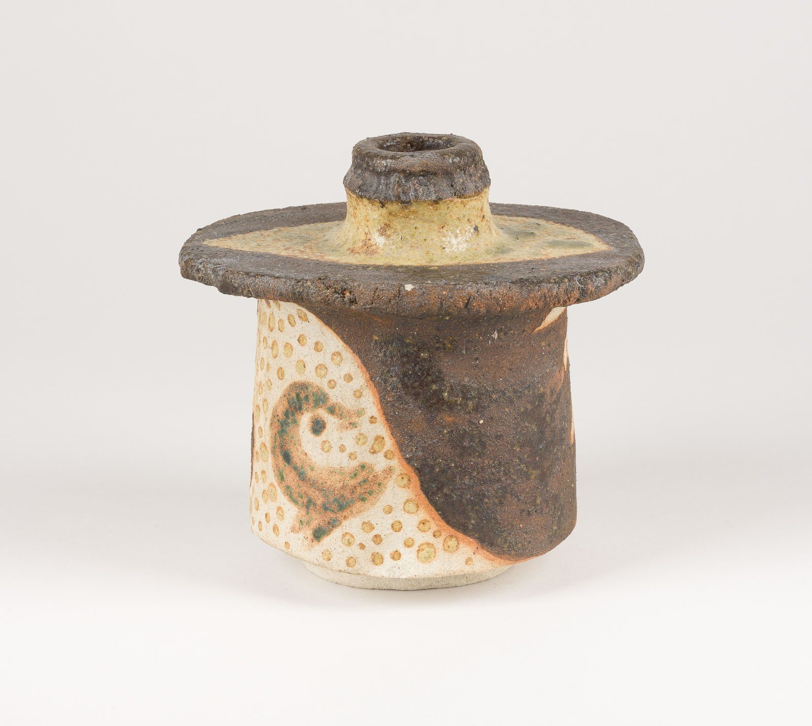 LOTTE MARIA REIMERS 1932 Hamburg VESSEL 1970 Pale, sand-like ceramic, freely formed, body with thin, mostly matt glaze painting in dark brown, pale orange, ochre and green. H. 12,5 cm, W. 13 cm, D. 10 cm. Marked underneath 'LR 70' (incised).