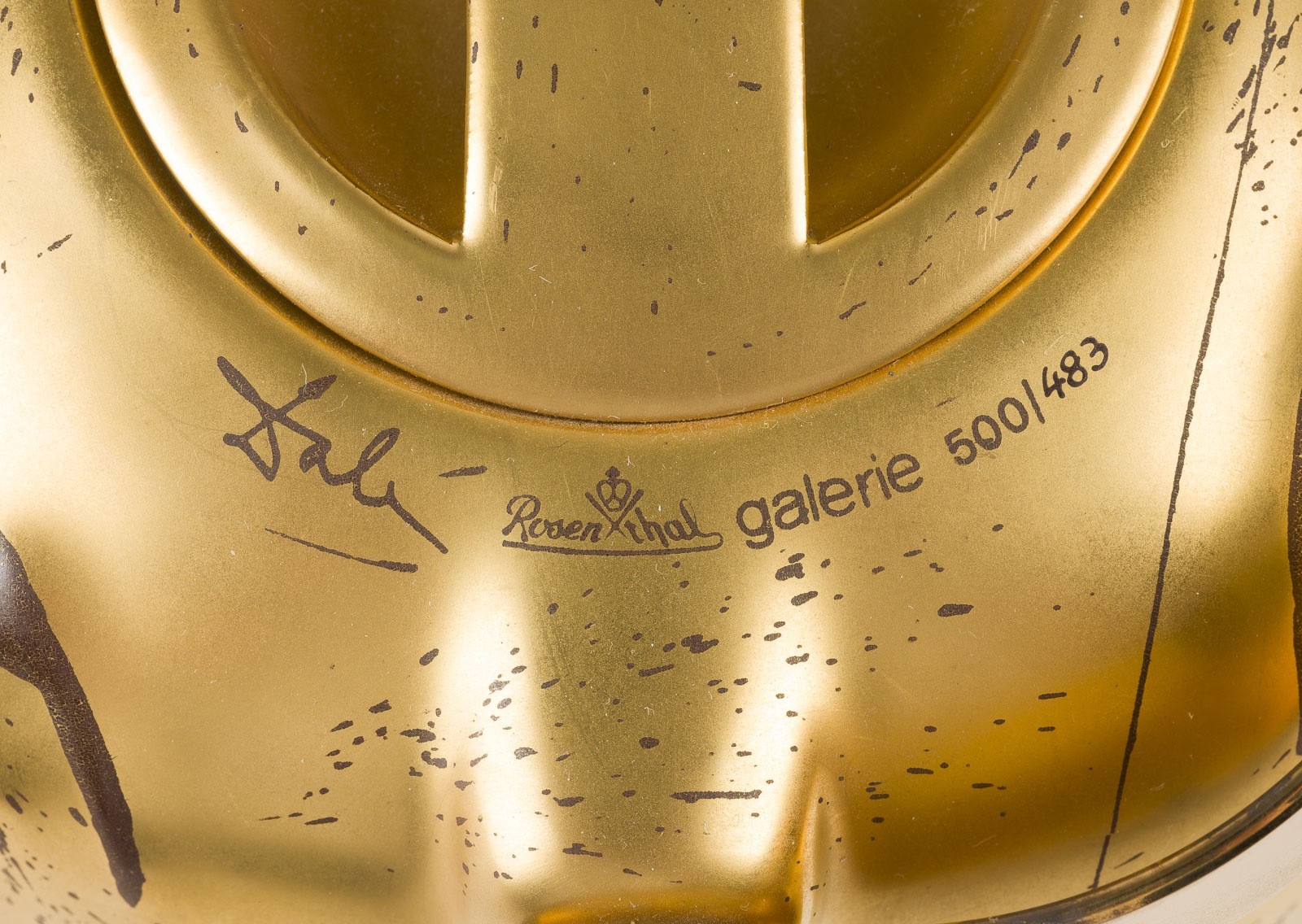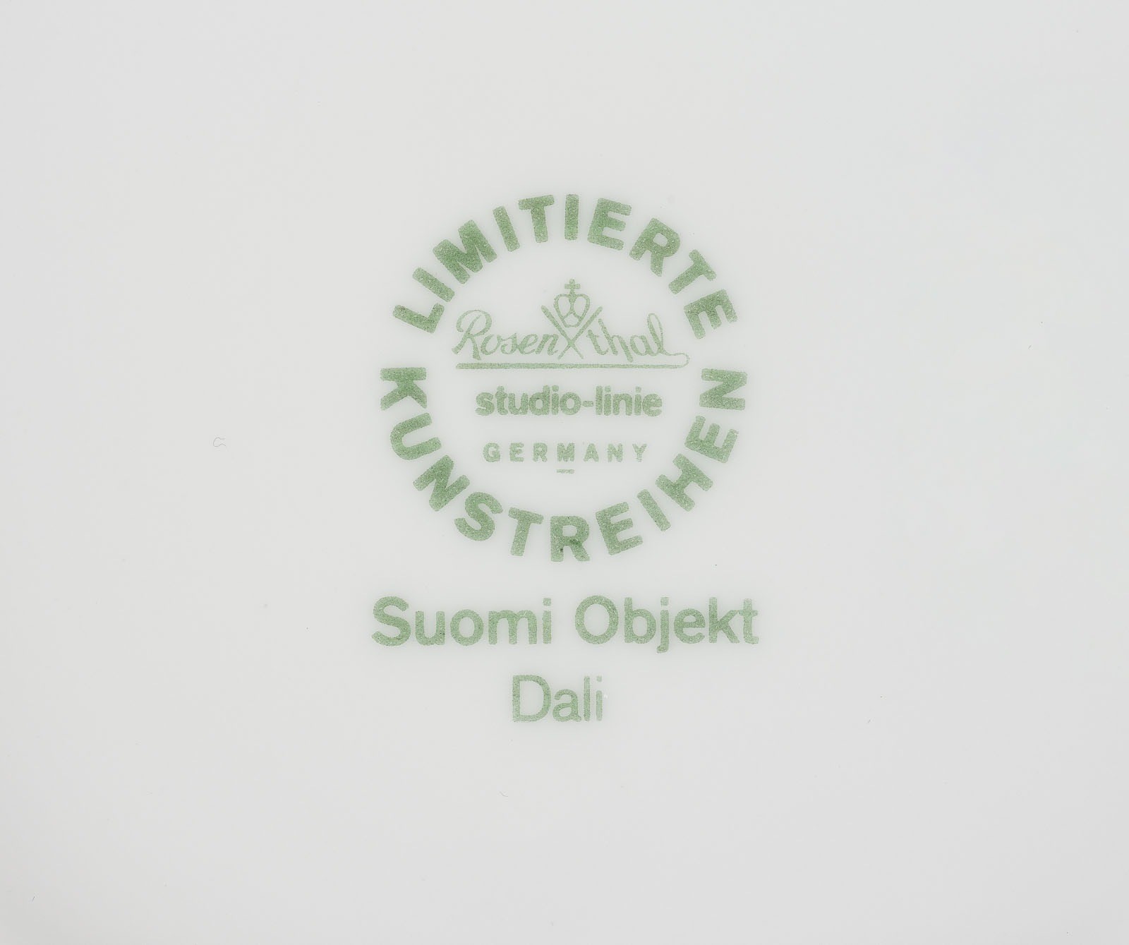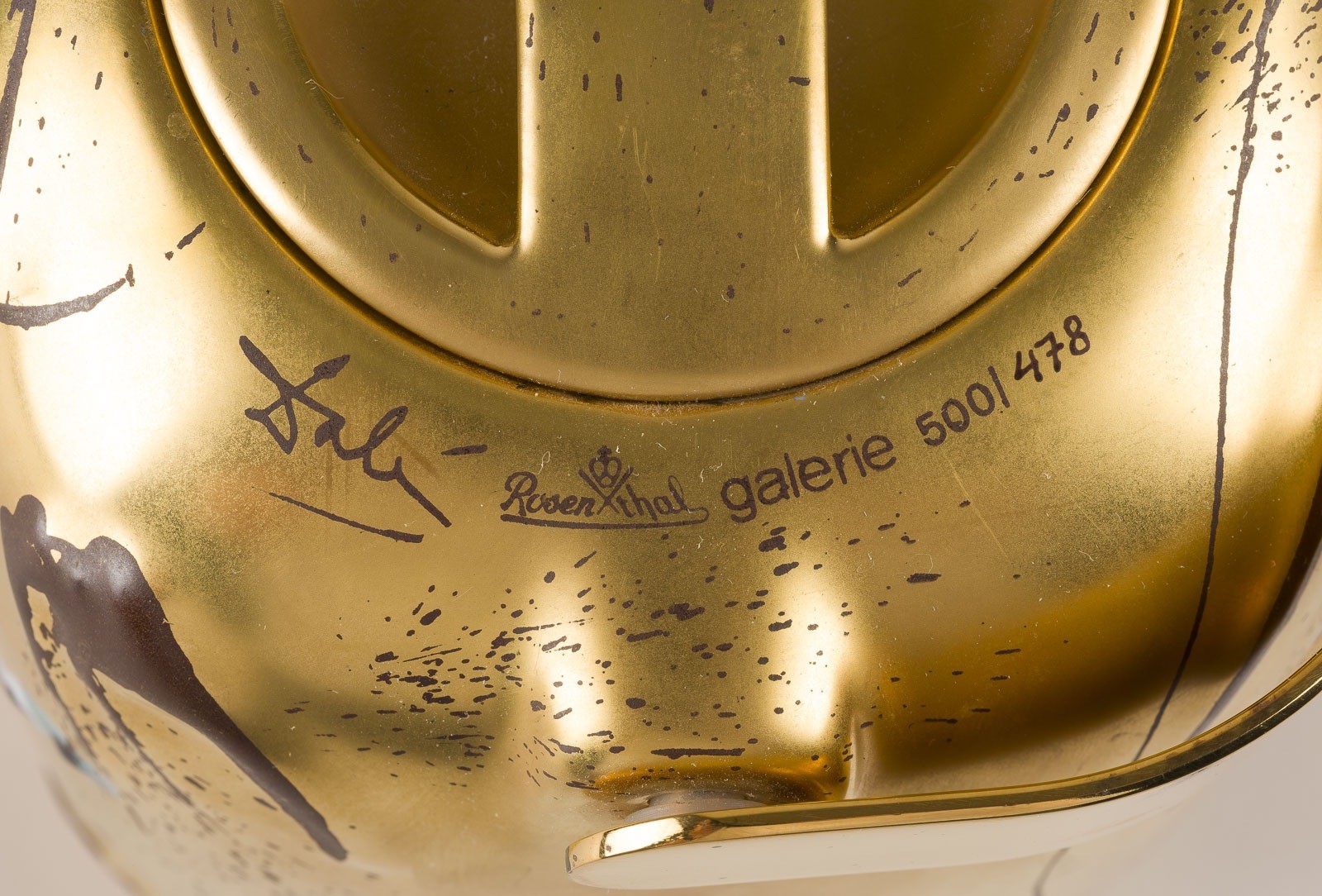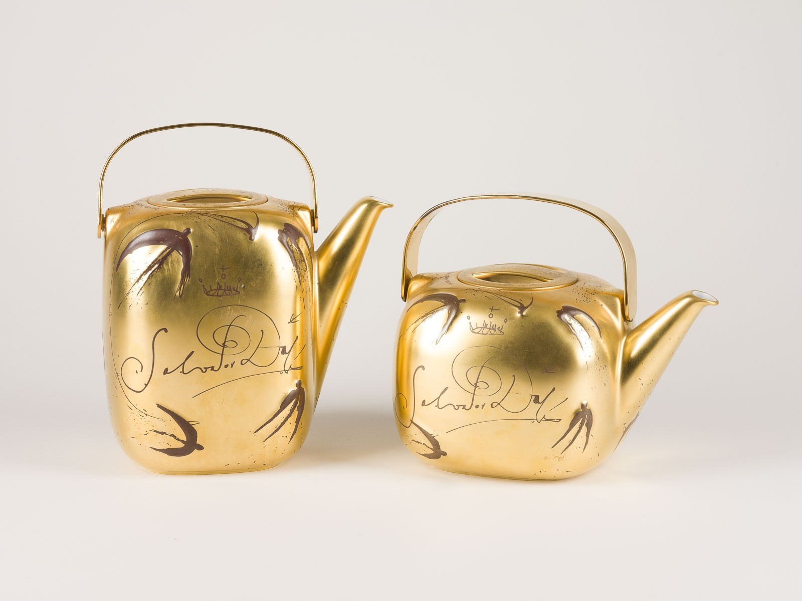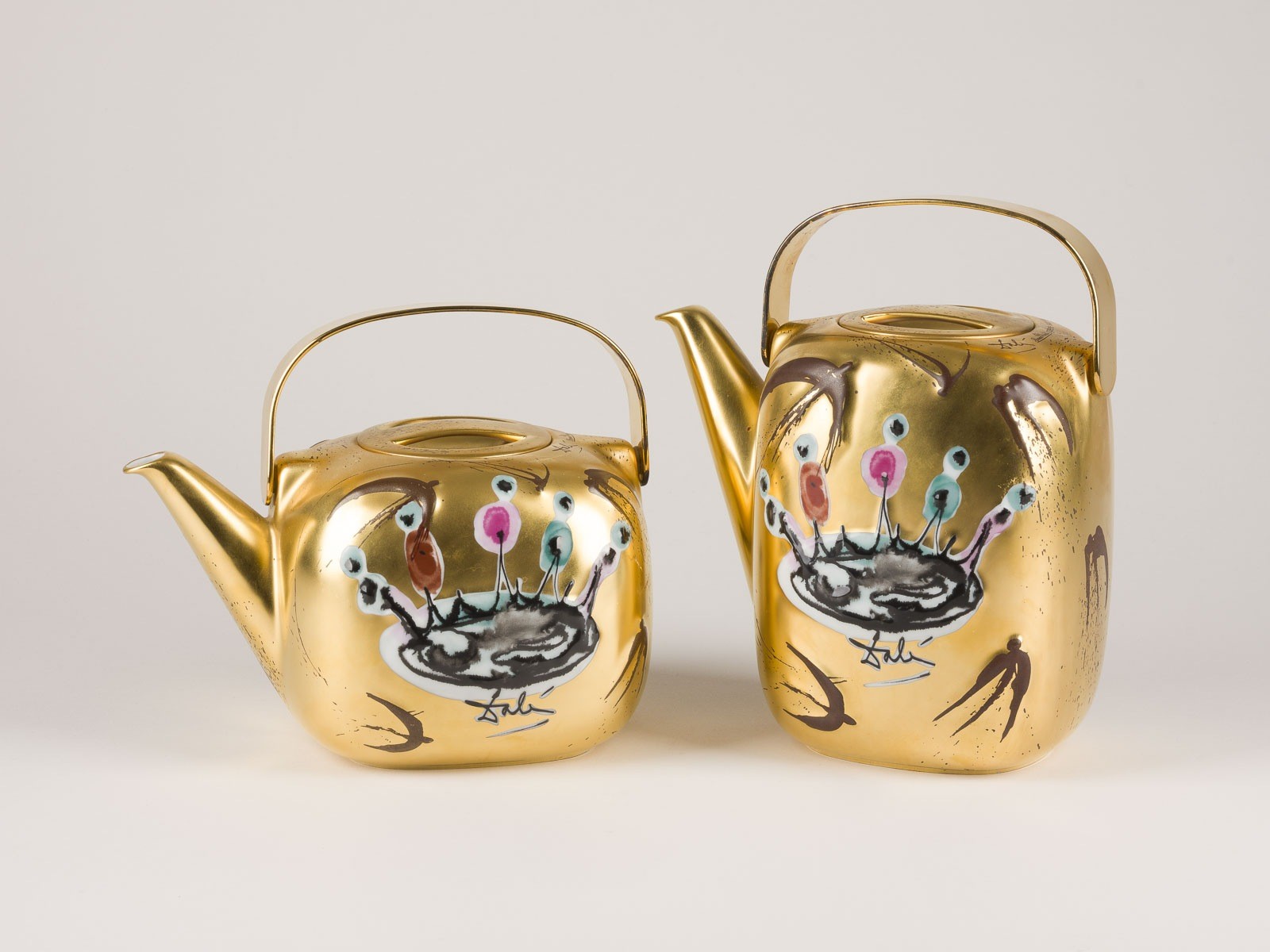 SALVADOR DALI 1904 Figueres, Girona - 1989 ibid. COFFEEPOT AND TEAPOT 'SUOMI OBJEKT 3' Germany, Rosenthal AG, pattern designed in 1974 White porcelain with relief decoration, polychrome and gold staffage, brass handle. H. 20,5 / 17 cm, W. 17,5 / 19,5 cm, D. 11,5 / 13 cm. Marked 'Dali Rosenthal galerie 500/478' u. 'Dali Rosenthal galerie 500/483'. Limited edition of 500 pieces. Shape designed by Timo Sarpaneva produced from 1976. Light traces of use, brass partly patinated.