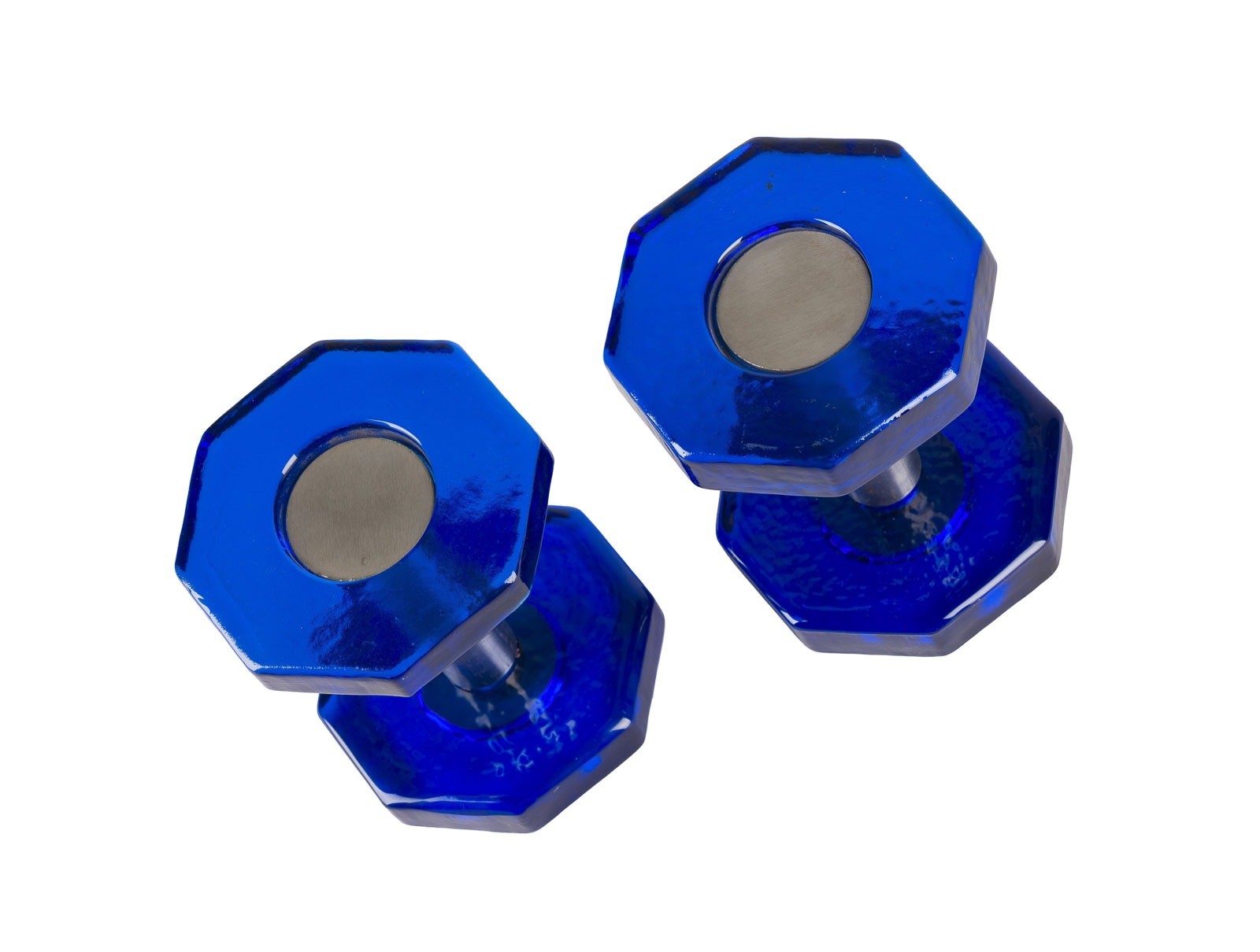 MURANO Italy PAIR OF DOOR HANDLES / KNOBS Italy, Murano around 1970 Cobalt blue glass 'a piastra', stainless steel. Each H. max. 12,5 cm, W. 11,5 cm, D. 15 cm. Minor signs of use.