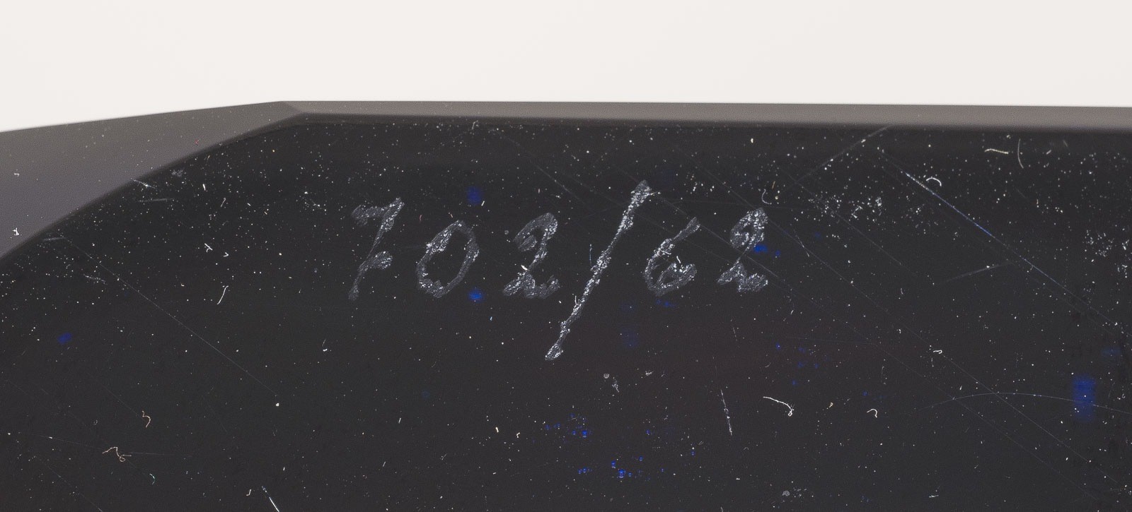 PAVEL HLAVA 1924 Semily, CSSR - 2003 PAIR OF VASES CSSR, most likely EXBOR, Design around 1960 Amber-coloured glass, colourless and cobalt blue overlay, cut, polished. H. 18,5 / 17 cm, W. 17 / 16 cm, D. 4,5 / 3,8 cm. Marked underneath '702/62' and '321/62' (incised). Provenance: Private collection Rhineland.