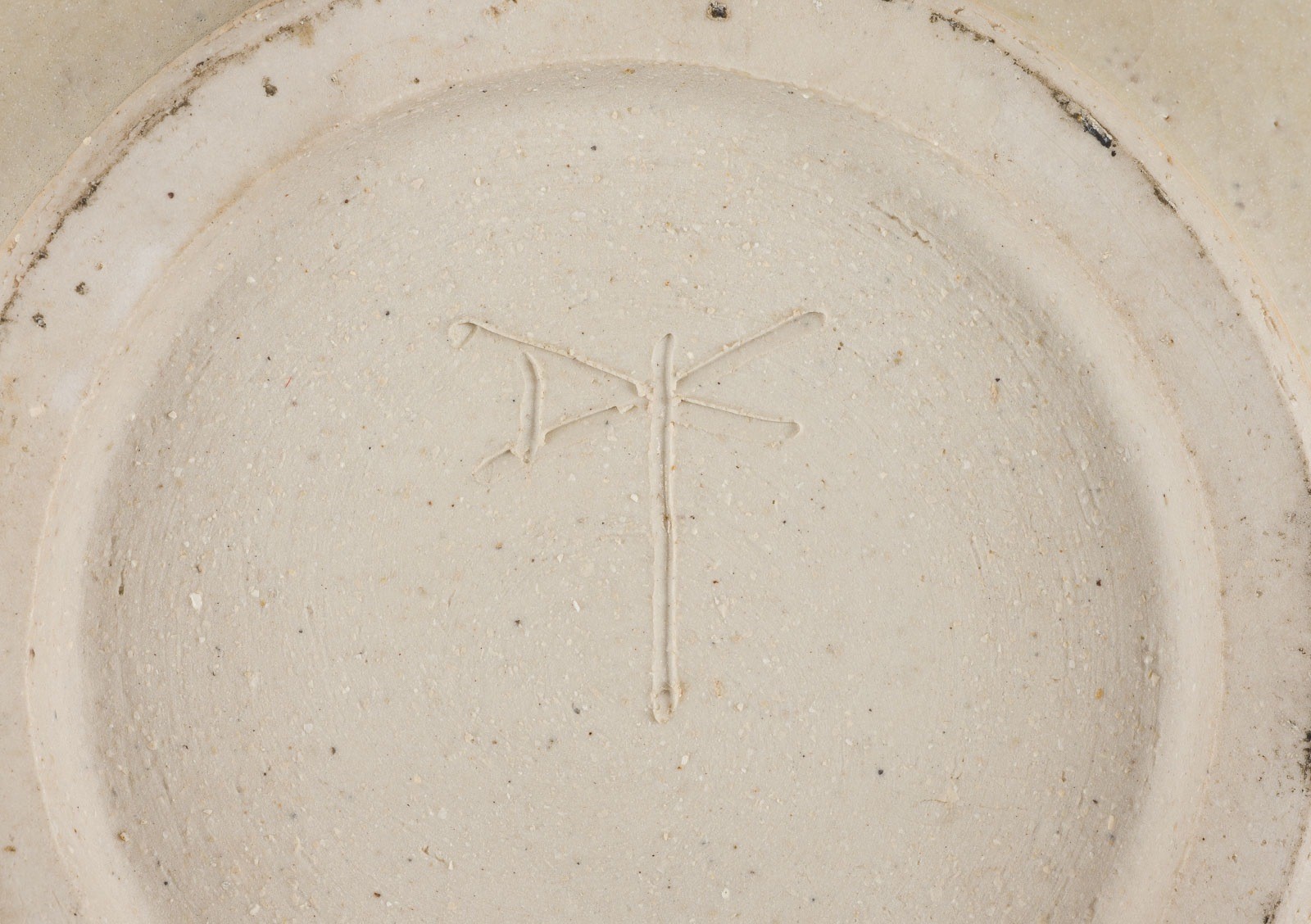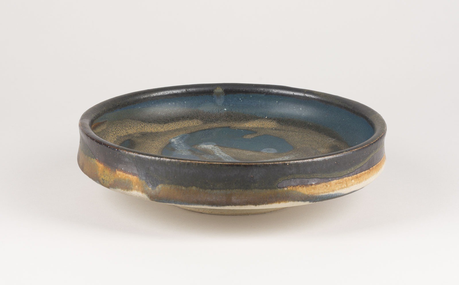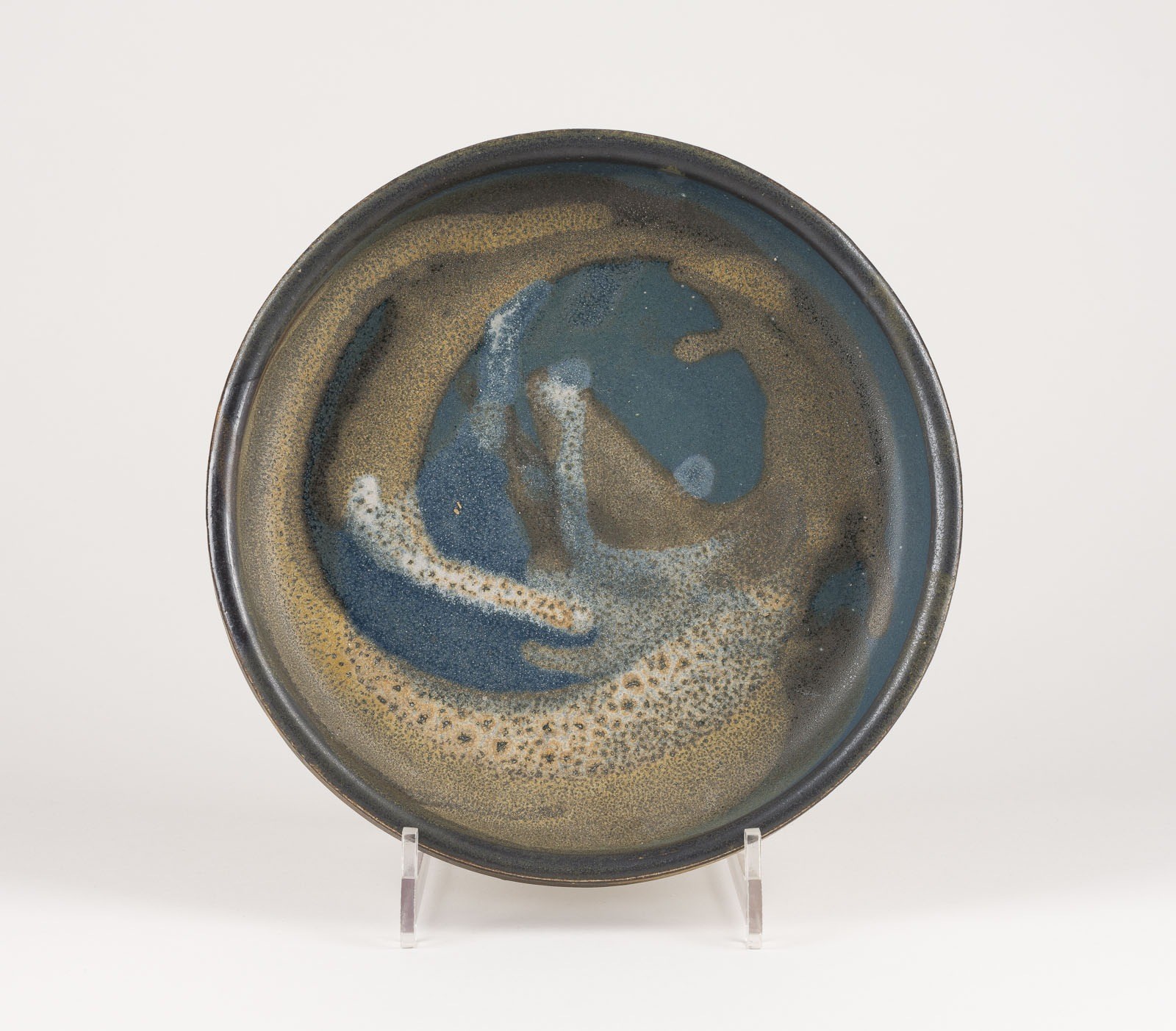 DIETER CRUMBIEGEL 1938 Essen BOWL circa 1975 Stoneware, thrown, light ochre ground, gestural glaze application in blue and brown tones on the upper body. H. 6 cm, D. 22,5 cm. Workshop mark underneath (incised). From a short foot ring, slightly rising, with steep, slightly indented wall, swinging in to the flat well.