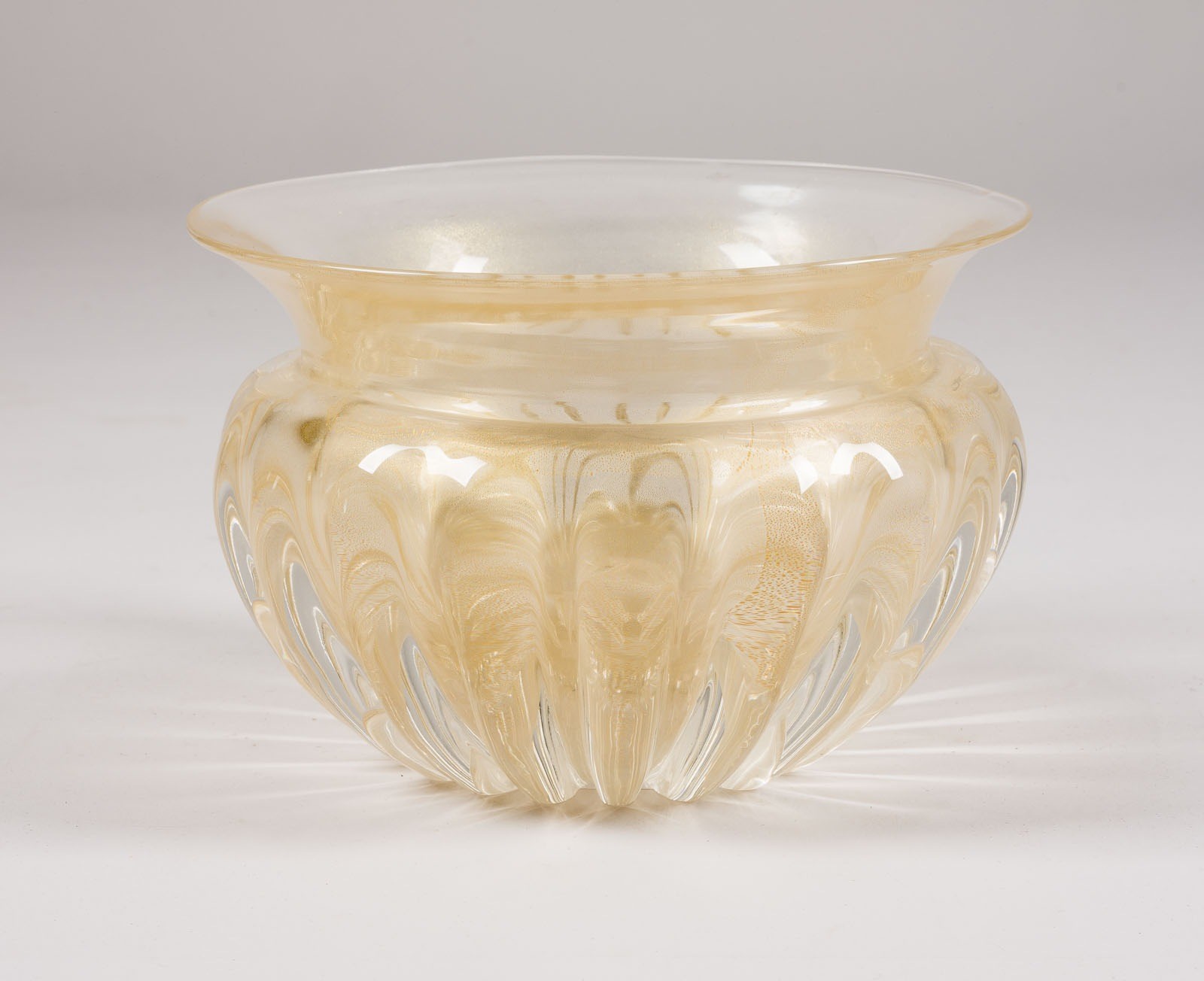 ARCHIMEDE SEGUSO 1909 Murano - 1999 ibid. HEAVY 'COSTOLATO' BOWL Italy, Murano, Archimede Seguso Colourless glass, intermediate layer w. gold foil,polished base. H. 14 cm, D. max. 20,5 cm. Marked underneath 'Archimede Seguso Murano' (incised).