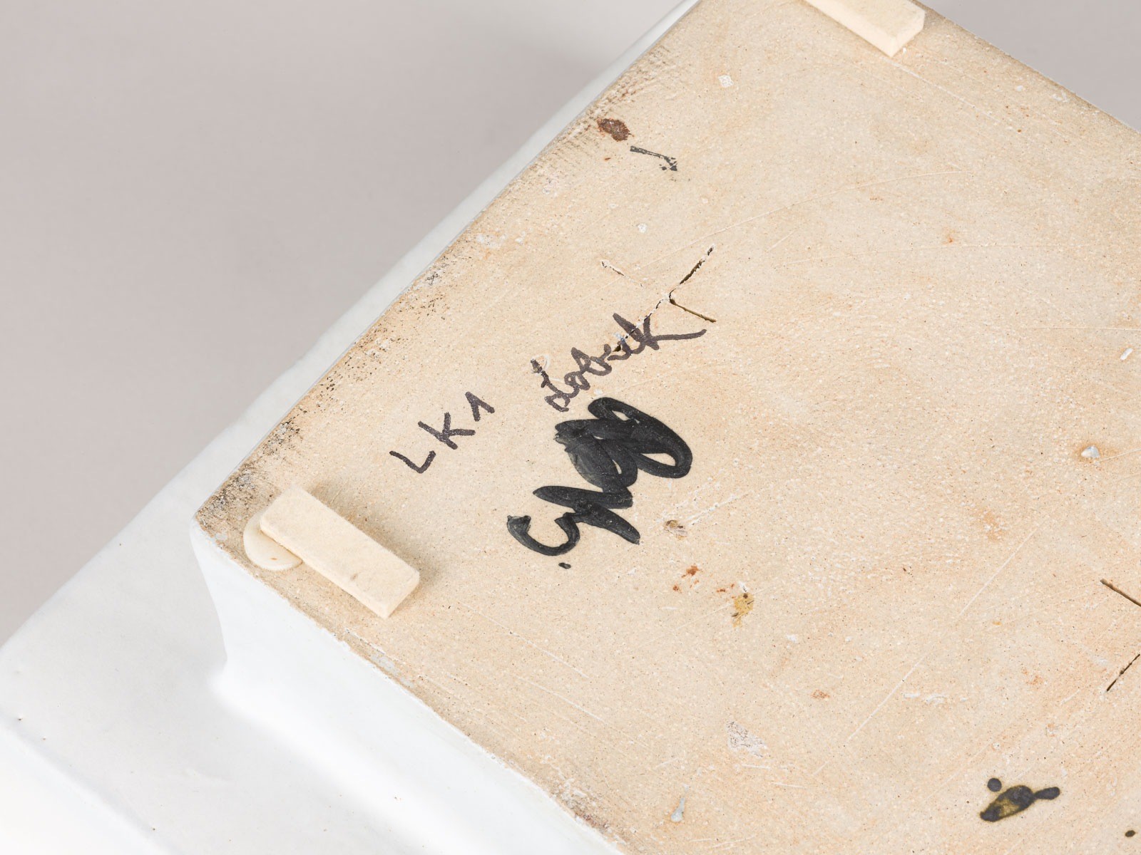 GORDON BALDWIN 1932 Lincoln, England 'SO CALL IT NOSTALGIA' Baldwin workshop 1975 Stoneware assembled, stepped cuboid shape, matt white-grey glaze, partly cloudy green, pink and black, top partially incised, cut, pierced with stencilled inscription 'so call it nostalgia'. H. 20 cm, W. 34 cm, D. max. 39 cm. Underneath signature and year 'GB 75' (brushed). Part. min. dam.. Provenance: Private property Bergisches Land.