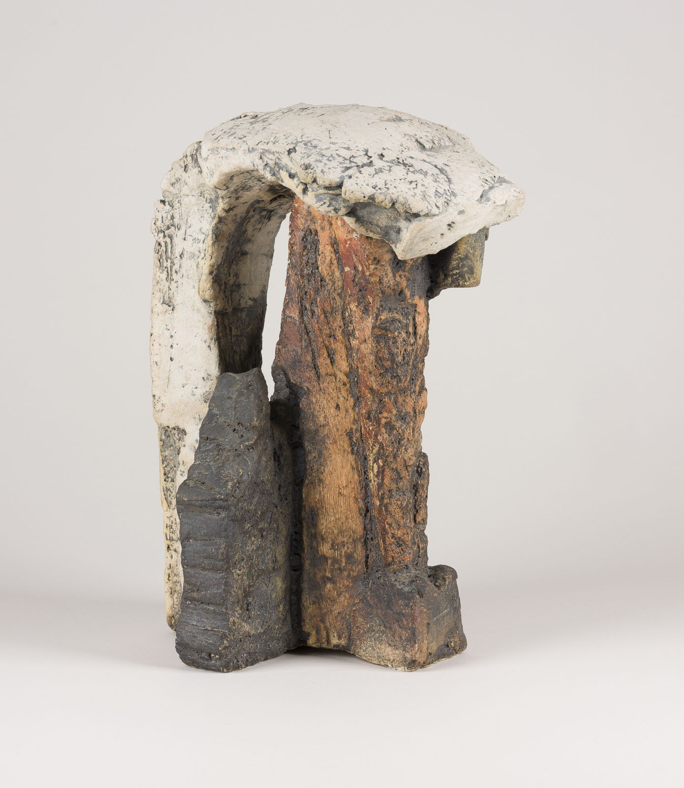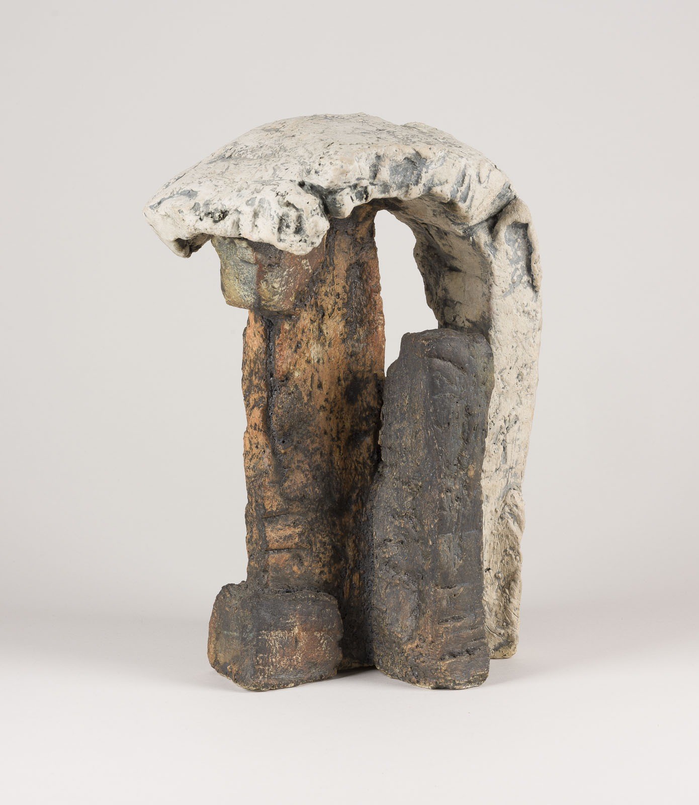 ROBERT STURM 1935 Bad Elster - 1994 Fulda OVERARCHING FORM after 1968 Pale stoneware clay, sculptural form assambled from slabs and blocks, matt glaze green-grey, partly rust brown and light ocher-greenish. H. ca. 27 cm, W. 19 cm, D. 15 cm. Workshop mark 'ST' underneath (engraved). Provenance: private collection Rhineland.