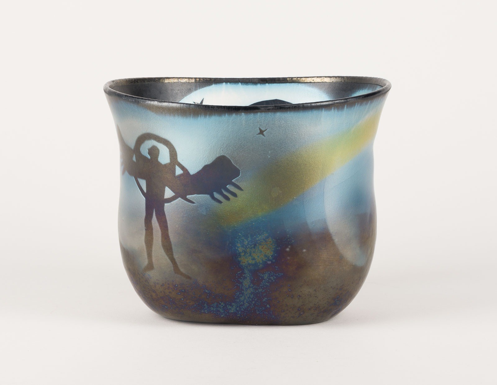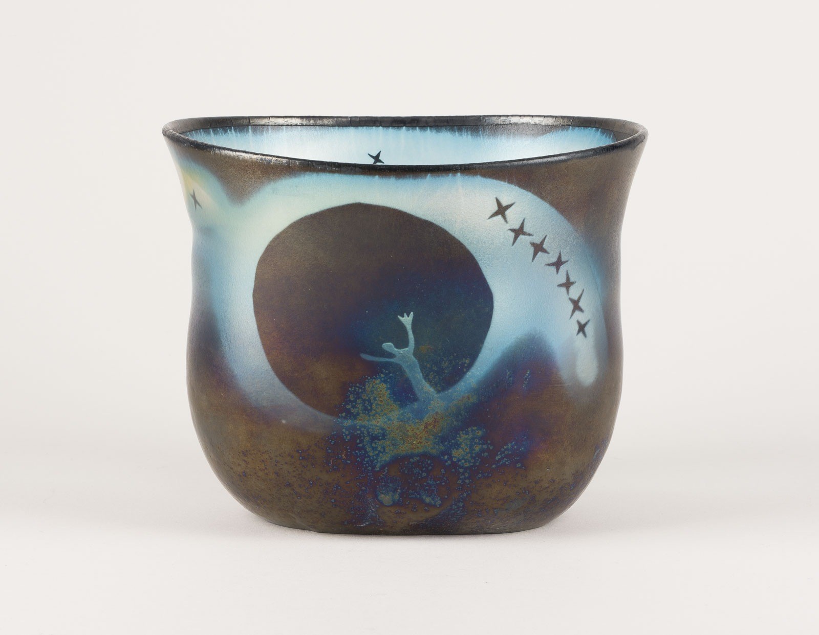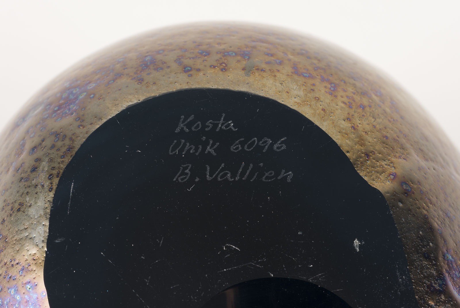 BERTIL VALLIEN 1938 Sollentuna, Schweden UNIQUE VASE '6096' Sweden, Kosta Boda, designed circa 1985 Glass, darkblue-black. light blue and yellow, colourless overlay, matt etched relief decoration on the inside, metallic, partly slightly iridescent, and applied relief on the outside. H. 14 cm, W. 17,5 cm, D. 15,5 cm. Signed underneath 'Kosta Unik 6096 B. Vallien' (incised).