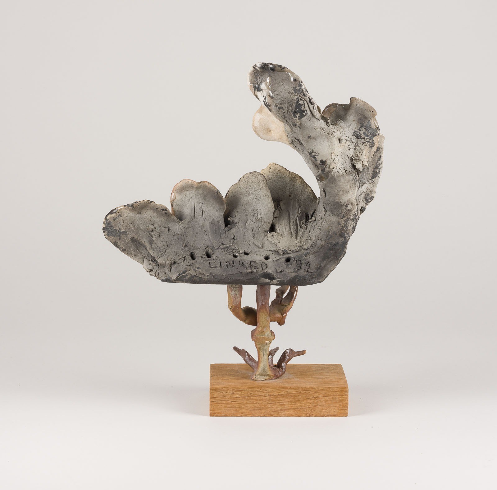 JEAN LINARD 1931 La Marche - 2010 Bourges 'VAUTOUR' VULTURE France, Atelier Linard, 1992 Ceramik, front partially glazed,rectangular oak base. H. 28 cm, W. 23 cm, D. 13 cm. Signed and dated 'LINARD 92' verso.