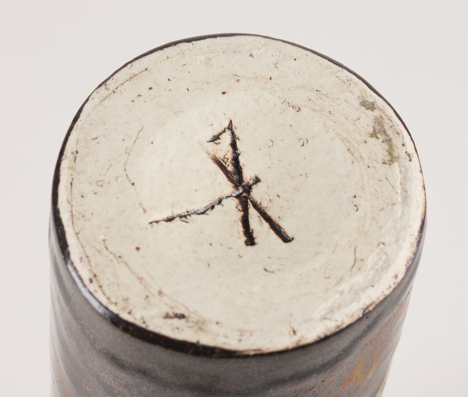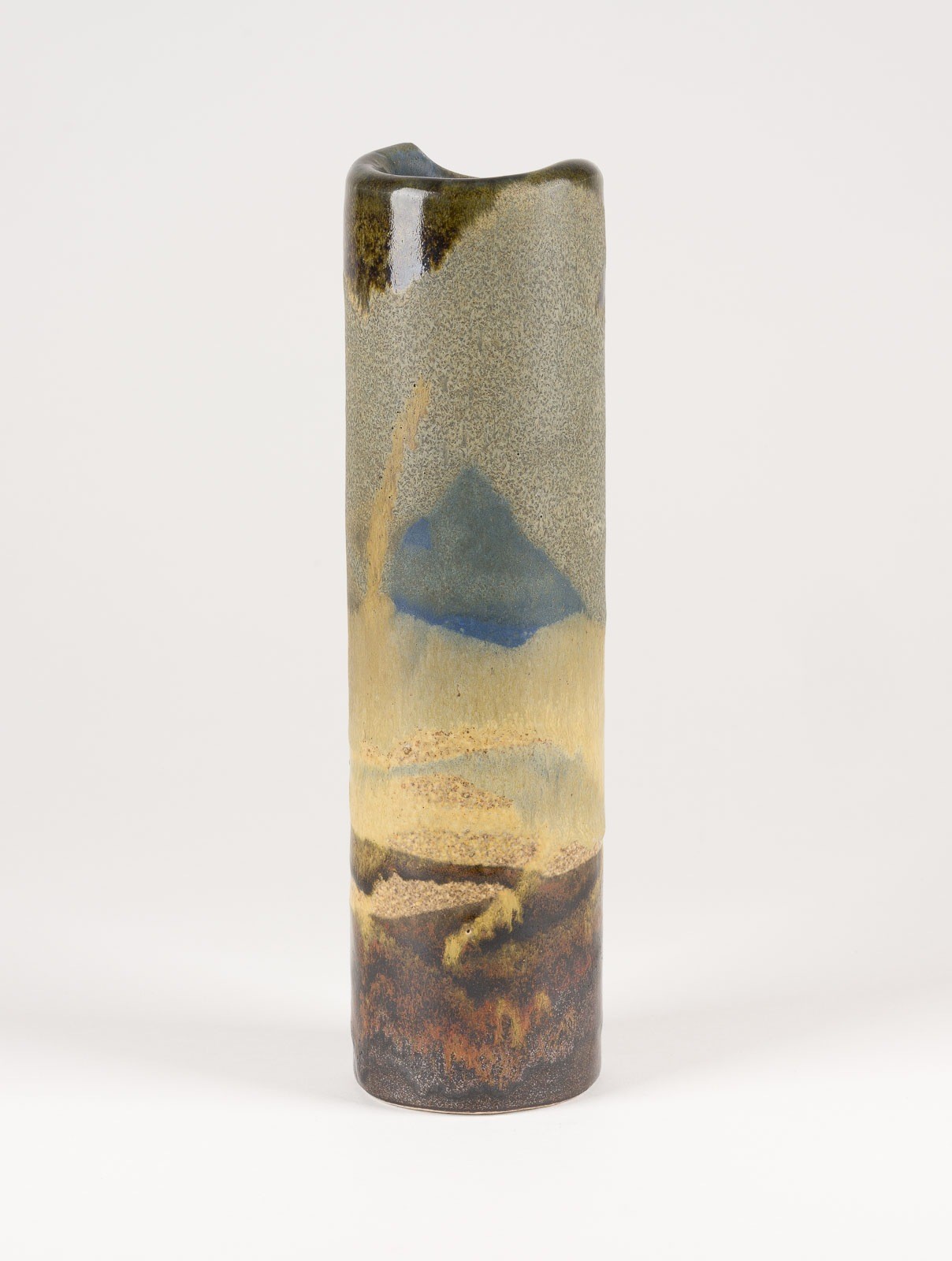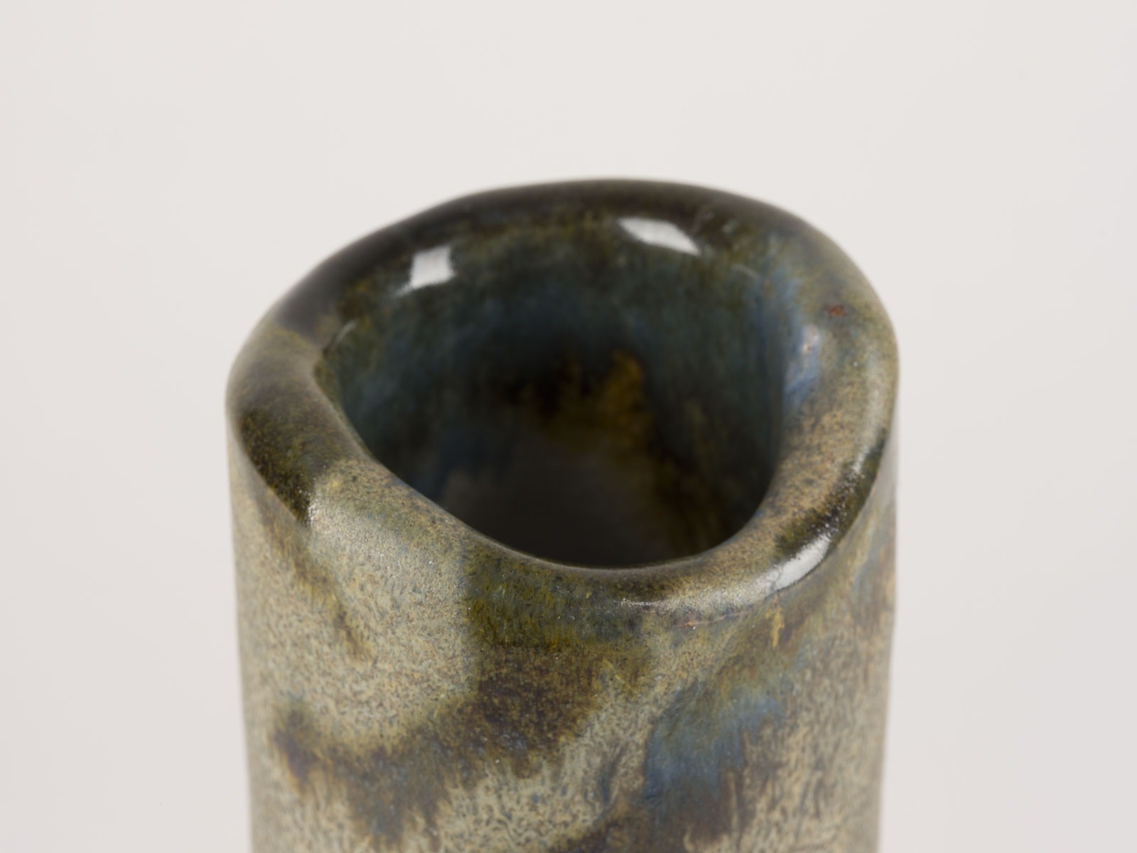 DIETER CRUMBIEGEL 1938 Essen CYLINDRICAL VASE circa 1975 Stoneware, formed, heavy drip glazes, ochre, olive, turquoise green, partly streaked, cloudy blue and metallic brown. H. ca. 27 cm, D. 7,5 cm. Mark underneath (incised).