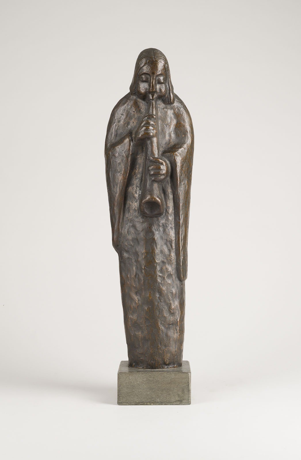 FRIEDRICH 'FRITZ' FRANZ VIEGENER 1888 Soest - 1976 Möhnesee-Delecke THE FLUTE PLAYER Bronze, darkbrown patinated, on stone base. Height 50.5 cm, total height 56 cm, total weight 8.8 kg. Monogramed on the back 'F.V.'. Mounting loosened, surface scratches at the base due to loose mounting.