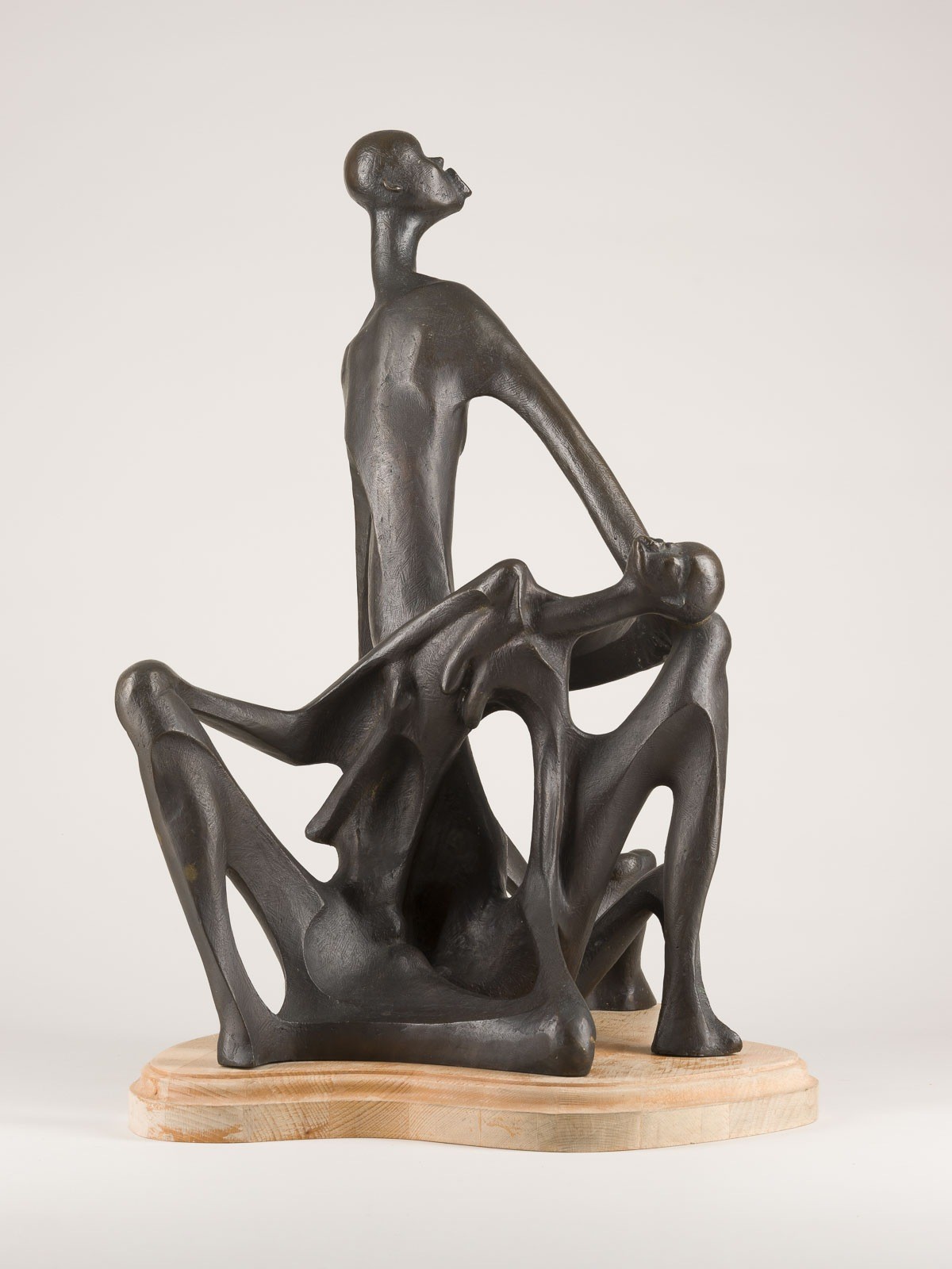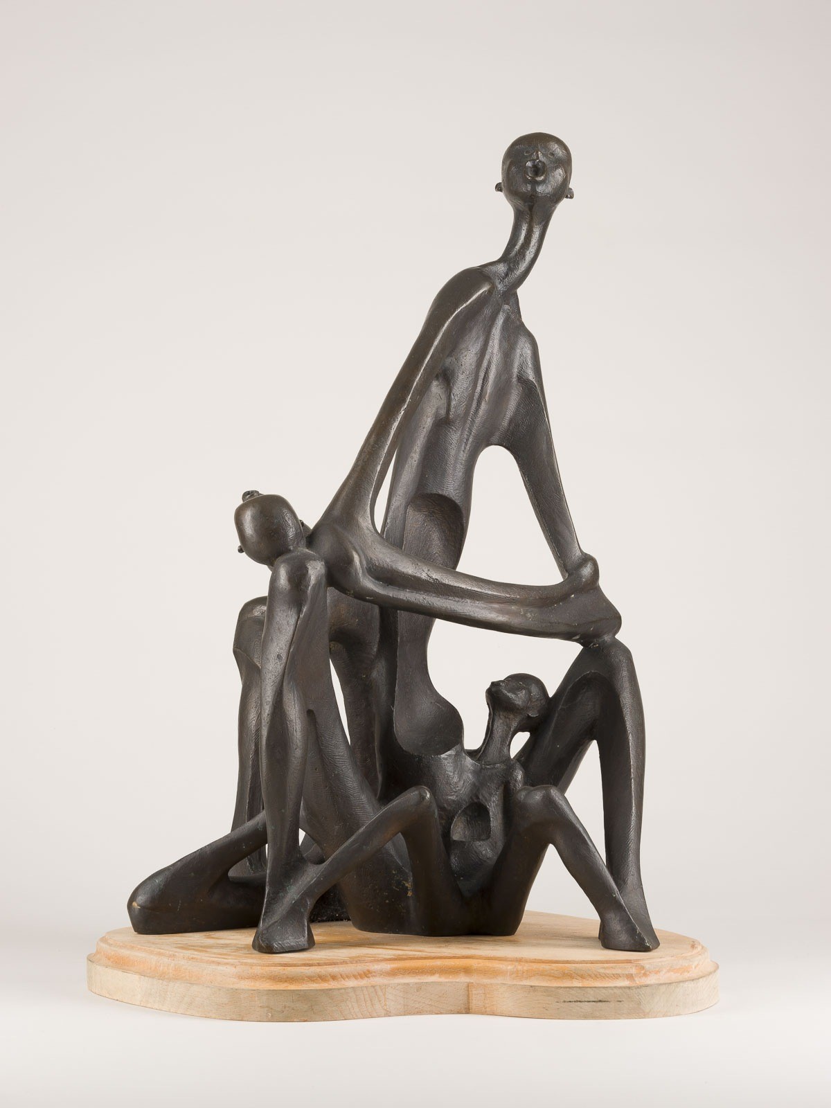 HATTAKITKOSOL SOMCHAI Bangkok, Thailand 1934 - 2000 GROUP OF THREE FIGURES (1985) Bronze, dark brown patinated, on wood base. Total height 62.5 cm. Bronze 58.5 cm high, 47 cm long. Total weight 16.4 kg. Signed and dated 'SOMCHAI (19)85' as well as with copy no. '1/9'. Partially losses of patina. Provenance: Private collection in the Bergisch area.