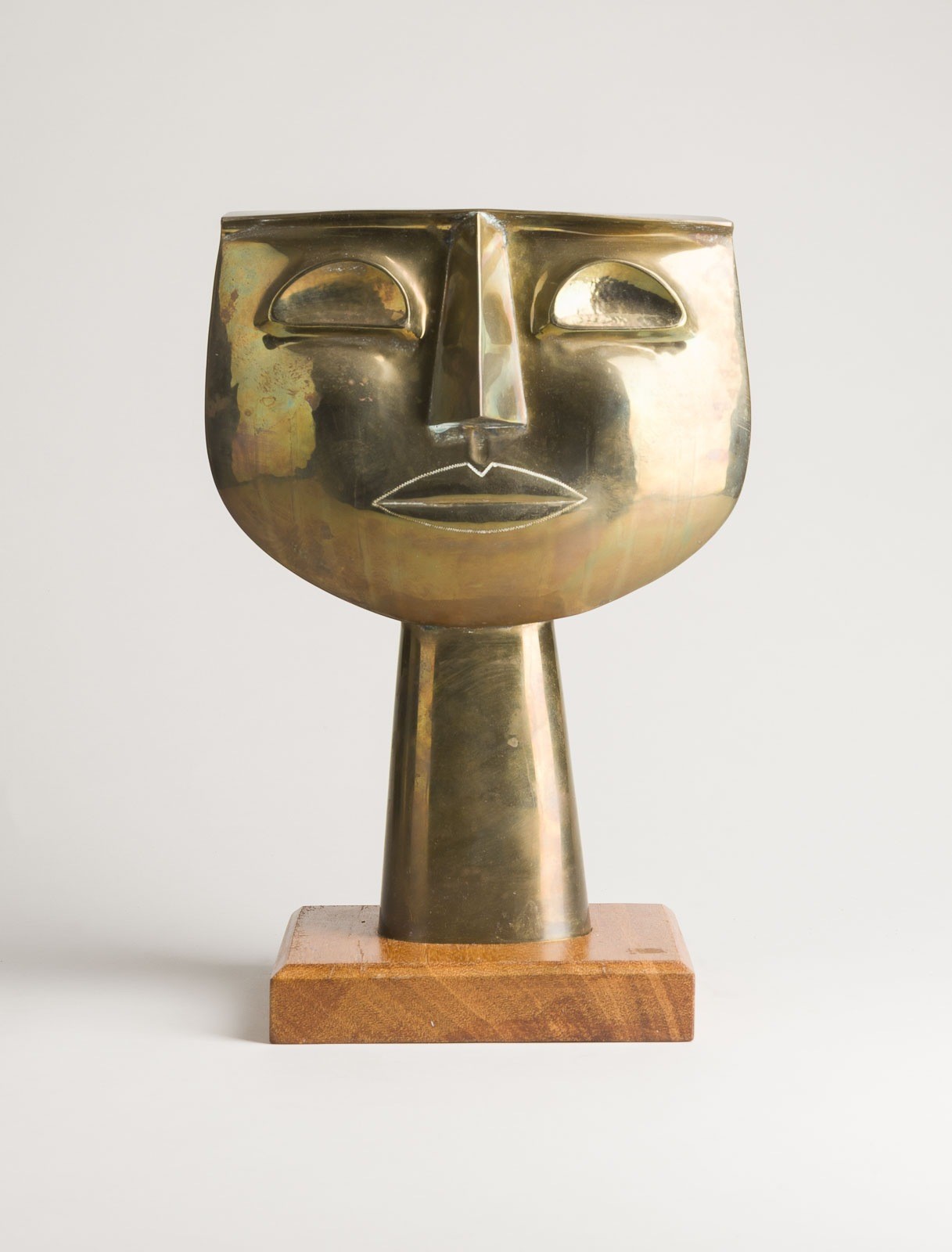 OSWALDO GUAYASAMIN 1919 Quito, Ecuador - 1999 Baltimore, USA HEAD Brass, wooden base. H. 35.2 cm, W. 25 cm, Total-H. 39 cm, weight 2,25 kg. Inscribed and signed at the verso. Part. slight traces of oxidation.