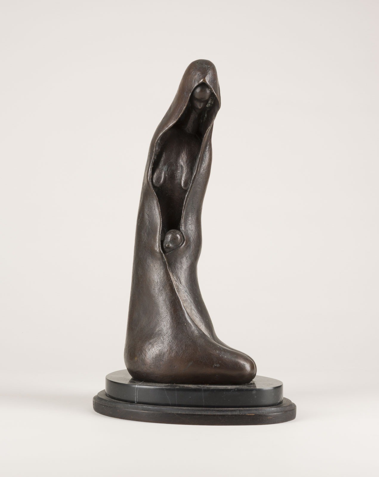 HATTAKITKOSOL SOMCHAI Bangkok, Thailand 1934 - 2000 MOTHER WITH CHILD (1985) Bronze, darkbrown patinated, on stone base on wood base. Total height 45 cm. Bronze 40.5 cm high, 12.5 cm wide, 17.5 cm long. Totel weight 7.9 kg. Signed and dated lower right 'SOMCHAI (19)85'. Base 1x min. bumped. Provenance: Private collection in the Bergisch area.