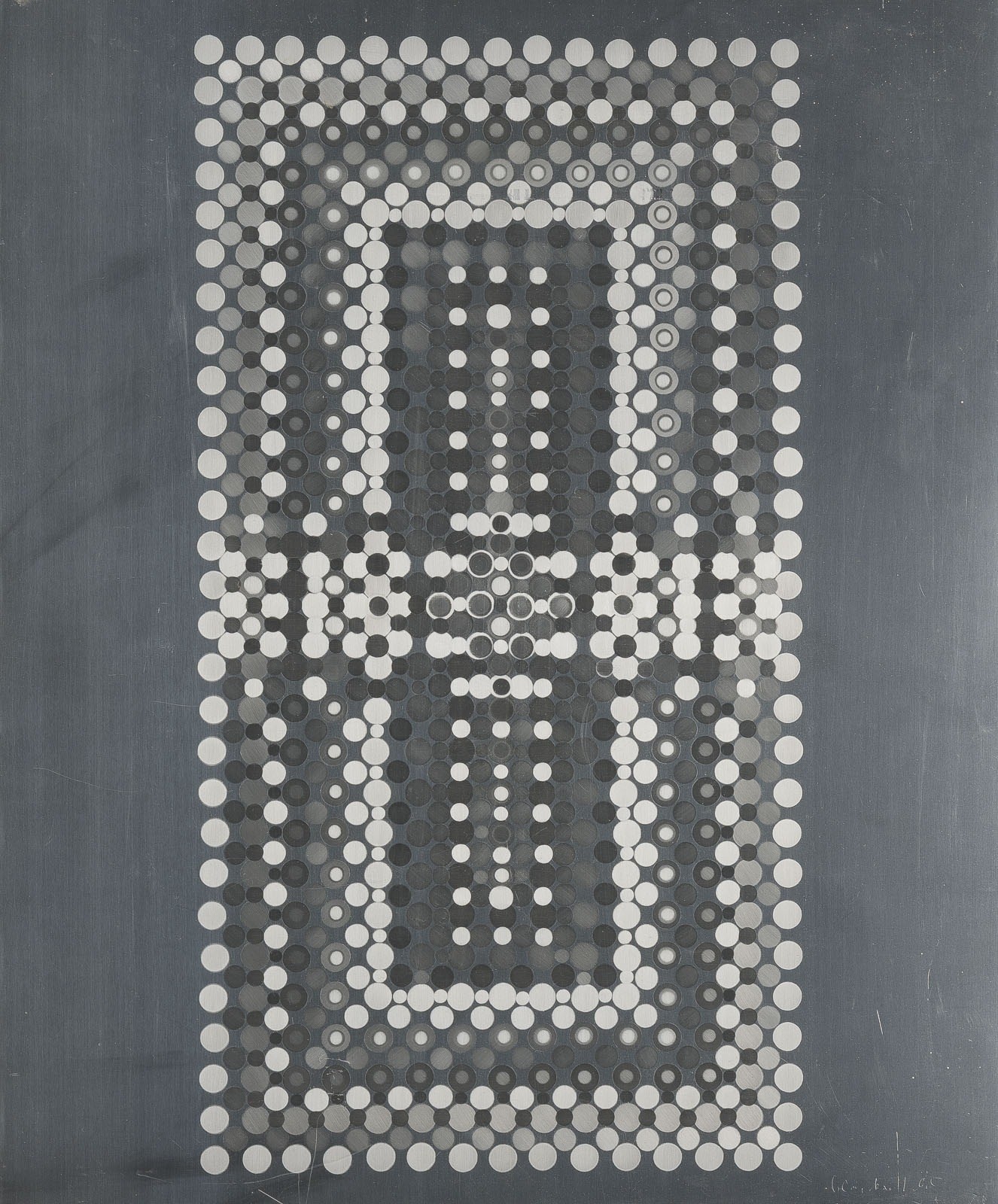 HAJO BLECKERT 1927 Stralsund - 1998 Düsseldorf UNTITLED (1965) Tinplate, mattet/polished, mounted on wood fibreboard. 60.2 x 50.2 x 1.5 cm. Scratched signature and date at bottom right 'bleckert 4 65'. Slight surface scratches.
