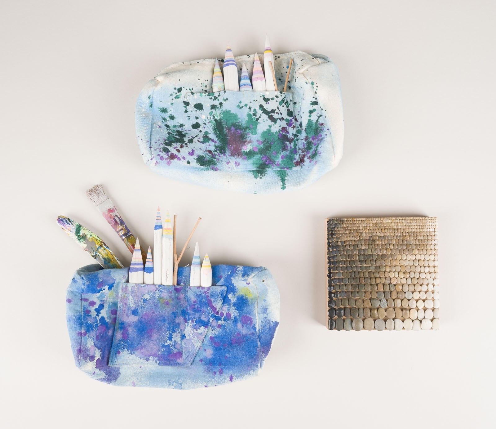 MARY HILDE RUTH BAUERMEISTER 1934 Frankfurt - 2023 Bergisch Gladbach TWO CULTURE BAG ASSEMBLAGES AND A SMALL STONE SCULPTURE (2013) Assemblage, two fabric bags, with wooden pins, brush and knife, each painted polychrome, and stone picture, stones on board. Assemblage each ca. 19 x 14 x 6 resp. stone picture 11,3 x 11,3 x 2,2 cm. Assemblages unsigned; stone picture inscr. on reverse '45A zusammen mit 45 B 2013 Sarah Hilfe'. Part. min. rubbed., part. min. bumped. Provenance: Private collection.