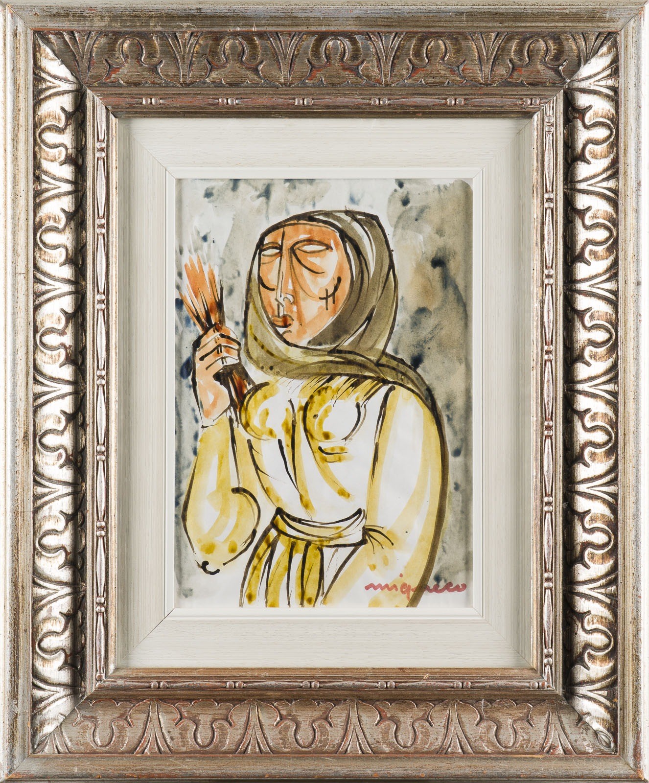 GIUSEPPE MIGNECO 1908 Messina, Italy - 1997 Milan, Italy FEMALE FARMER Gouache on paper. Frame size 52.7 x 44 cm. Visible size 28.5 x 19.8 cm. Signed lower right 'migneco'. Paper slightly wavy due to manufacturing. Framed in passe-partout and behind glass (unopened). Provenance: Private collection in the Lower Rhine region.