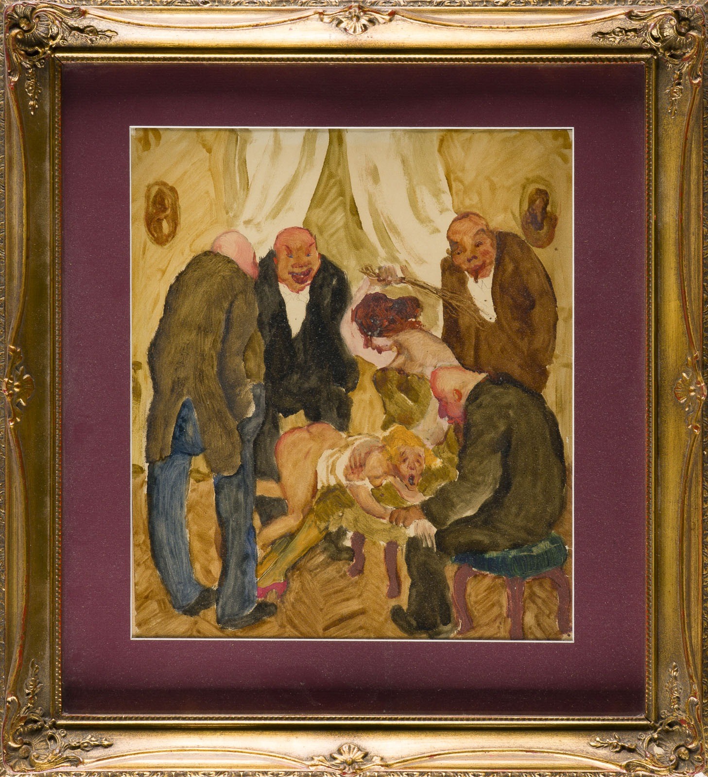 MODERN ARTIST active 1st half of the 20th c. BROTHEL SZENE Mixed media on heavy paper. F 53,5 x 48,5 cm, 36,3 x 30,9 cm. Unsigned. Small pinholes in the corners, adhesive residue on the reverse, some crasing on the edges. Mounted and framed behind glass. Provenance: Private collection, Southern Germany.