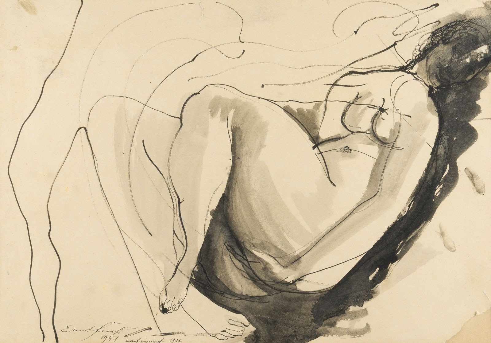 ERNST FUCHS 1930 Vienna - 2015 ibidem NUDE (1947) Ink drawing on wove paper. Frame size 57 x 71.8 cm. Visible size 34.3 x 49.8 cm. Signed and dated lower left 'Ernst Fuchs 1947' (signed in 1966). Unevenly browned and with slight foxing, some tears to the margins and the lower right corner damaged. Framed in passe-partout and behind glass (unopened).