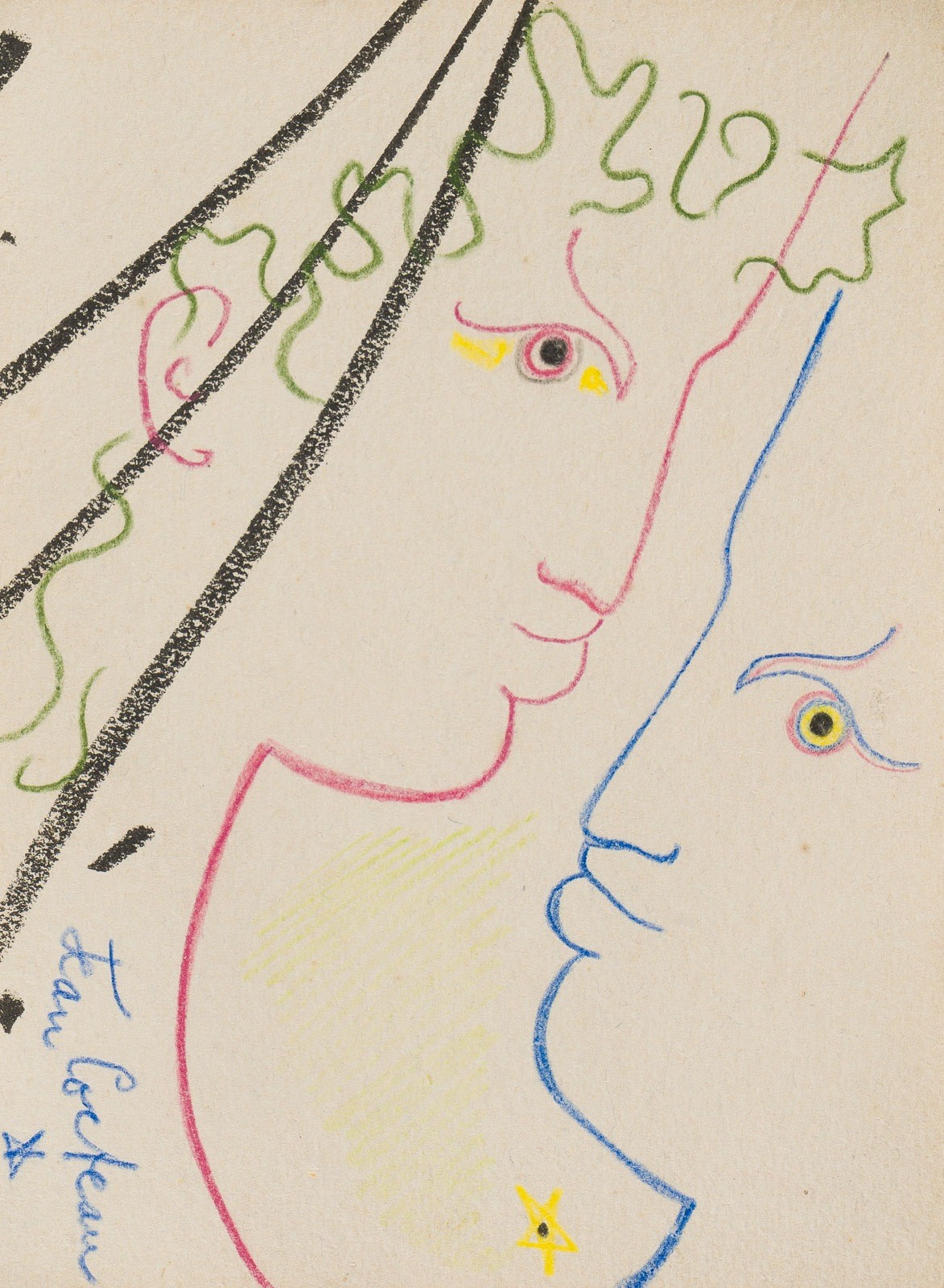 JEAN COCTEAU 1889 Maisons-Laffitte - 1963 Milly-la-Forêt near Paris DOUBLE PORTRAIT IN PROFILE Coloured pencil over lithograph on firm paper. Frame size 45.6 x 40 cm. sheet dimensions 18.6 x 13.6 cm. Signed 'Jean Cocteau' on the lower left side. Very slight foxing. Mounted on light ardboard and framed in passepartout behind glass (unopened). Provenance: Renowned private collection; previous owner was from the artist's close circle.