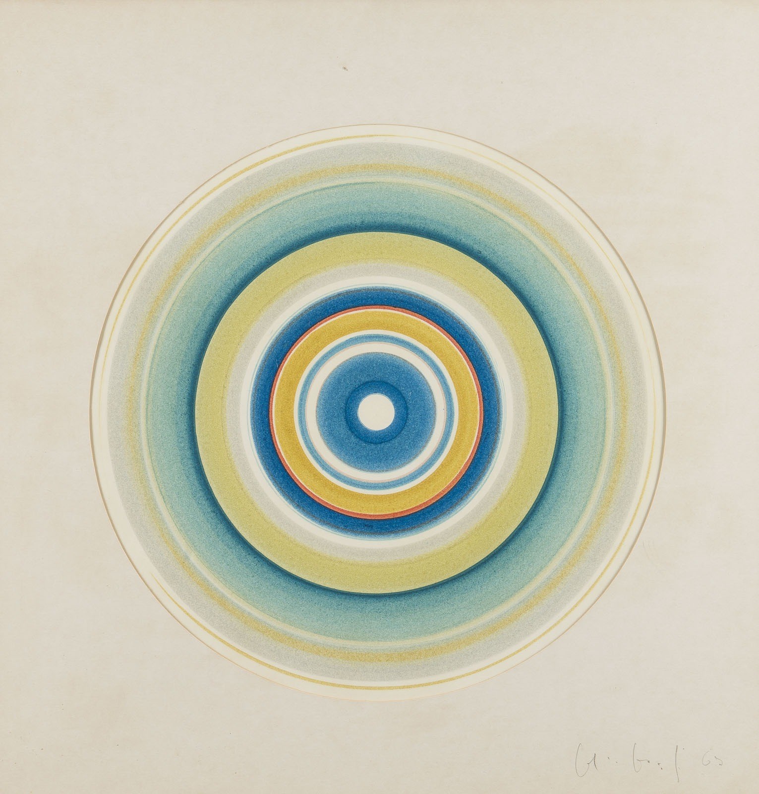 HAJO BLECKERT 1927 Stralsund - 1998 Düsseldorf CIRCLE COMPOSITION (1969) Watercolour on paper. Frame size 42 x 42.2 cm. Visible dimensions 26.2 cm in diameter. Signed and dated in pencil at lower right. Framed in passe-partout and behind glass (unopened).