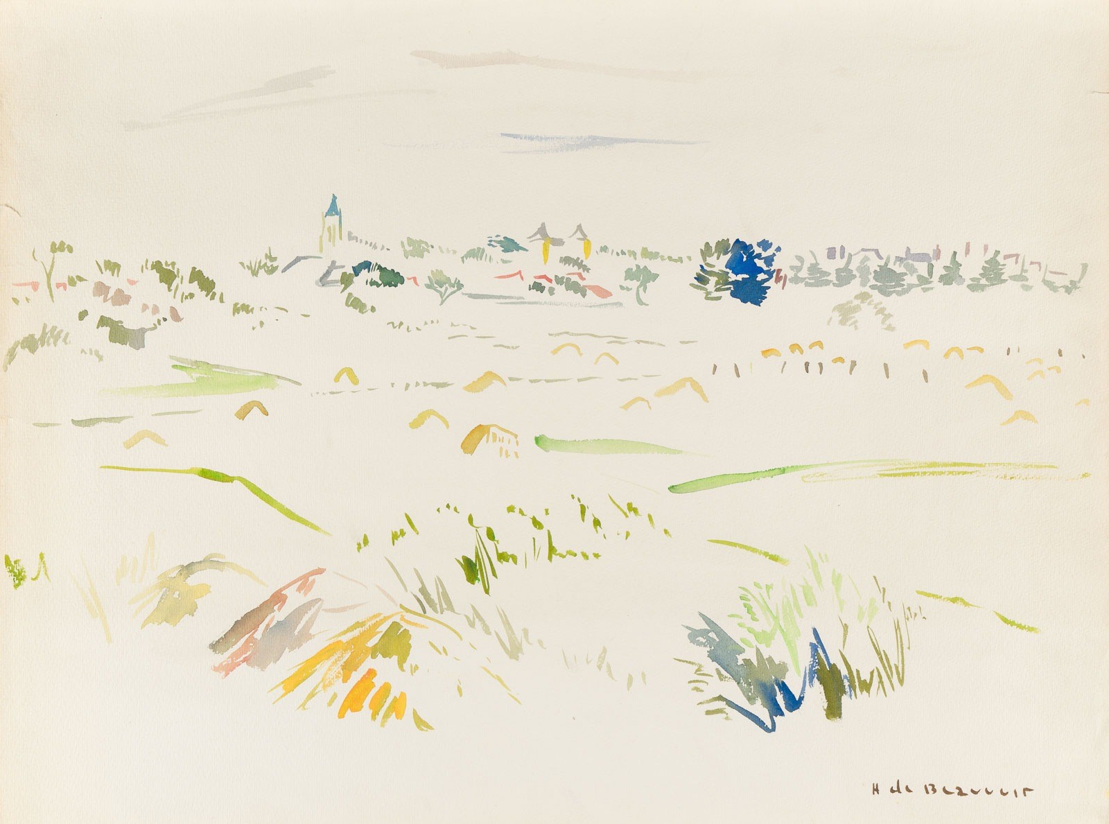HELENE DE BEAUVOIR 1910 Paris - 2001 Goxwiller LANDSCAPE WITH VILLAGE Watercolour on C.M. Fabriano paper, with watermark. Sheet dimensions 37.6 x 50.7 cm. Signed lower right 'H de Beauvoir'. Inscribed in pencil by an unknown hand on the verso as well as with traces of an old mounting. Partially soiled at the sides as well as with small tears of max. 11 mm and the lower right corner with crease mark. Unframed.