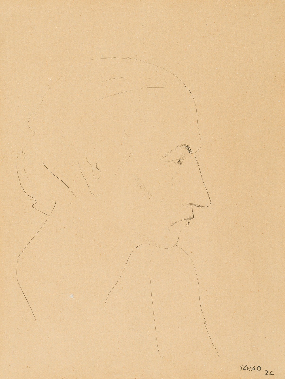 CHRISTIAN SCHAD 1894 Miesbach - 1982 Stuttgart UNTITLED (PORTRAIT OF A WOMAN IN PROFILE) (1926) Ink drawing on paper. F 35,7 x 29,2 cm, sheet size 21,3 x 16,1 cm. Signed and dated lower right 'Schad (19)26'. Residual adhesive on reverse, browned in old passe-partout cut-out. Mounted and framed behind glass. Provenance: formerly Galerie Thomas Levy, Hamburg; most recently private collection Düsseldorf.