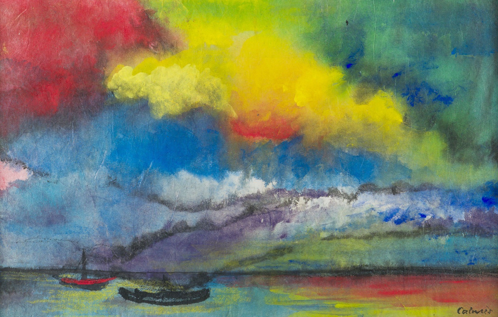 PETER CALMES Duisburg 1900 - 1968 LAKE VIEW WITH BOATS Gouache on thin japanpaper. Frame size 41.2 x 51 cm. Sheet dimensions 30.3 x 47.8 cm. Signed lower right 'Calmés'. On the verso with remnants of an old mounting at the upper margin. Framed behind glass (unopened). Provenance: Private collection in the Bergisch area.