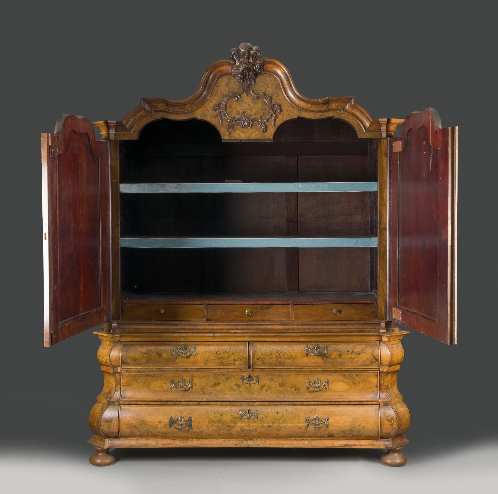 BAROQUE CANTILEVER CABINET German or Dutch, circa 1750 Solid walnut, burl walnut veneer, with key. H. 252, W. 198, D. 67 cm. Four-drawer curved base with pressed ball feet. Cassetted two-door top section with curved pediment and crown molding, richly profiled, applied rocaille decorations, three drawers and two shelves inside. Bumped, veneer damage, minimally damaged, rest.