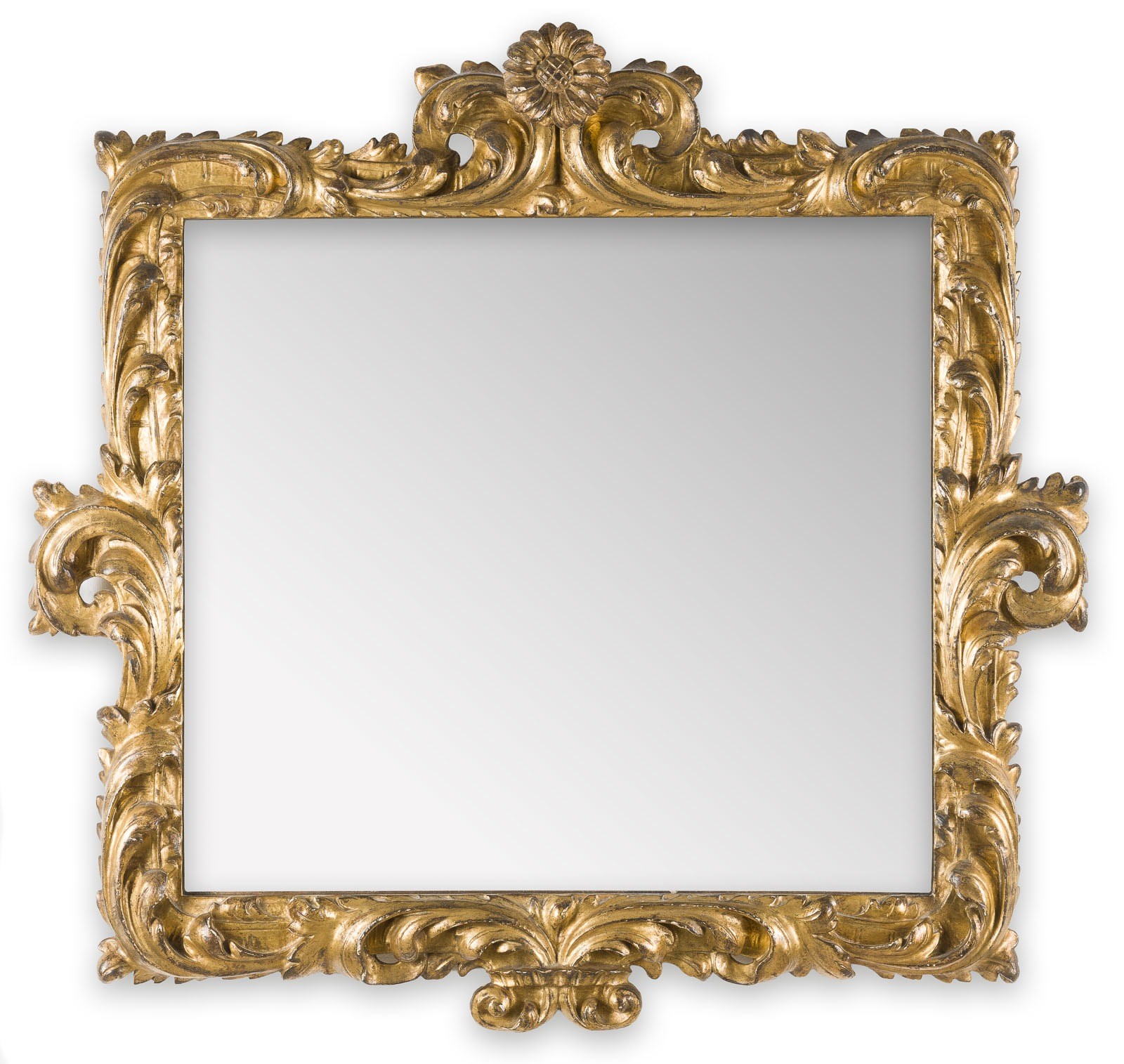 BAROQUE MIRROR Probably Italy, 18th century. Wood, carved, gilded. H. H. 87, W. 93, D. 13 cm. Rectangular frame with applied flowers and rocaille decoration. Partially intact, gold wear, glass slightly clouded.