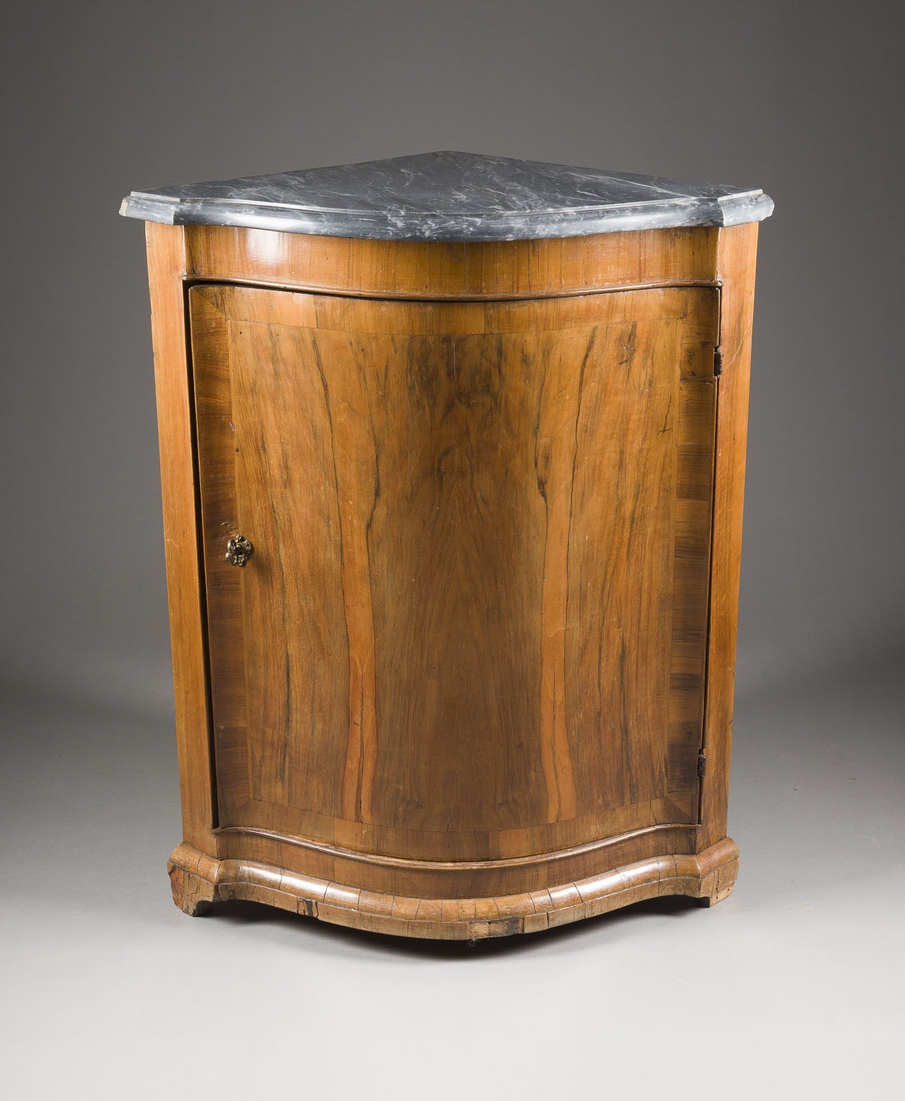 CORNER CABINET German, circa 1800 Wood, 1 door, curved front, two shelves, with marble top. H. 92 cm, side length 52 cm. Partially bumped, veneer damage.