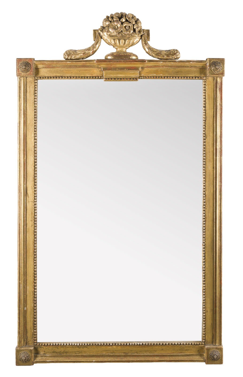 ELEGANT LOUIS XVI WALL MIRROR France, 1780/90 Wood, carved, gilded, mirror glass. H. 106, W. 63, D. 6 cm. Tall rectangular profiled frame, beaded decoration, classic fluting, corner spurs with square appliqués and floral rosettes, antique-style vase (Médicis form) with lavish floral decoration above the mirror glass. Partially bumped and damaged, rest.