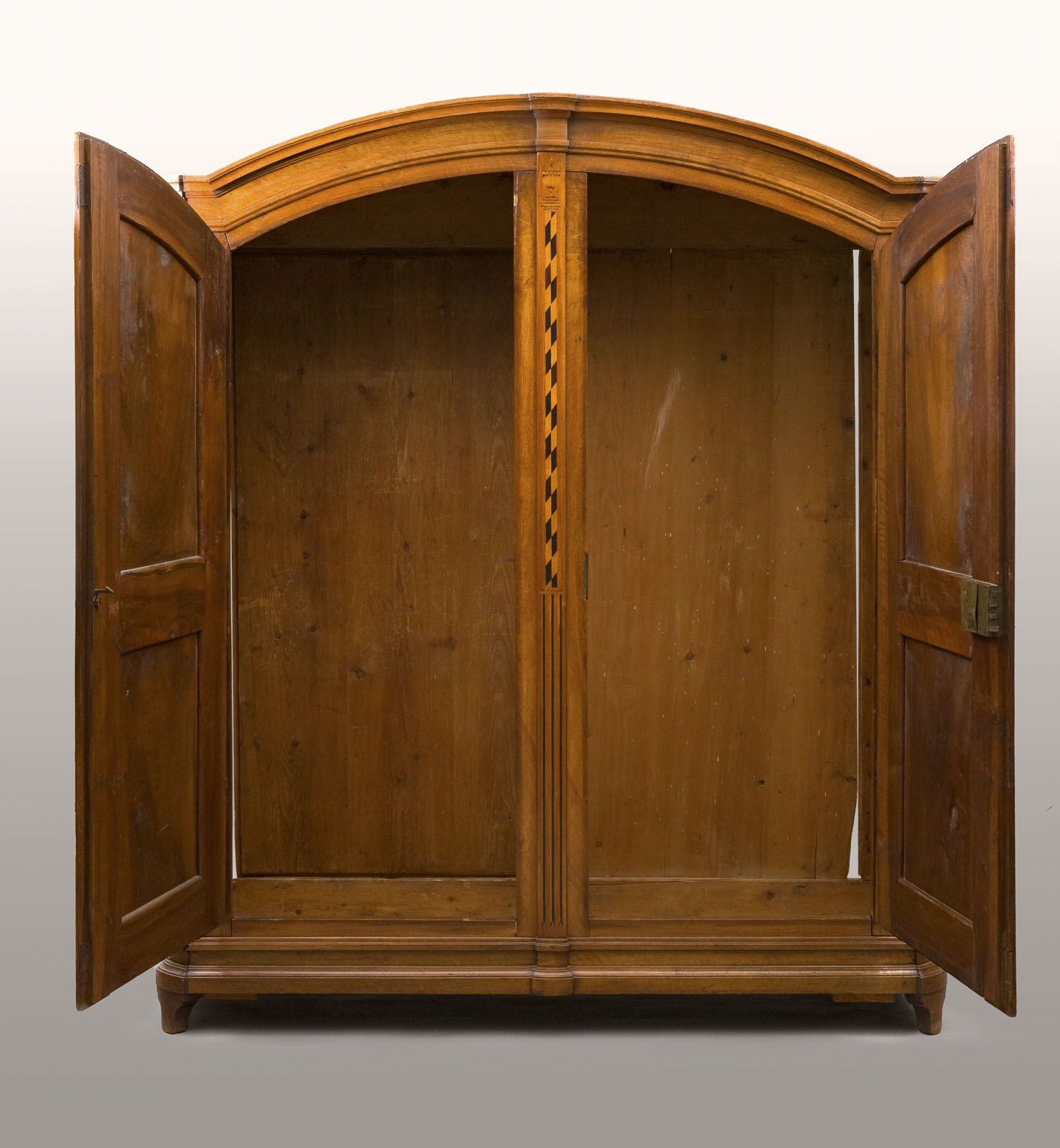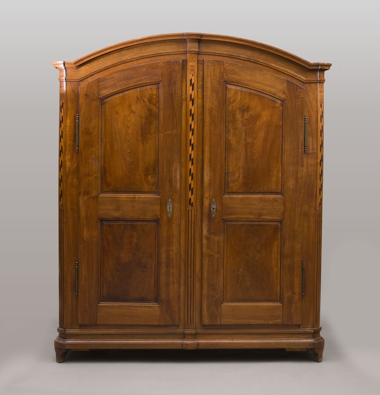 LARGE BIEDERMEIER CABINET WITH INLAY WORK Lake Constance, 1812 Oak, walnut, veneered. H. 223, W. 180, D. 68 cm. Monogrammed 'AB?' and dated '1812' on the lock. Tall two-door cabinet with symmetrical panels, rounded gable top and inlaid band inlay. Partially bumped and damaged.