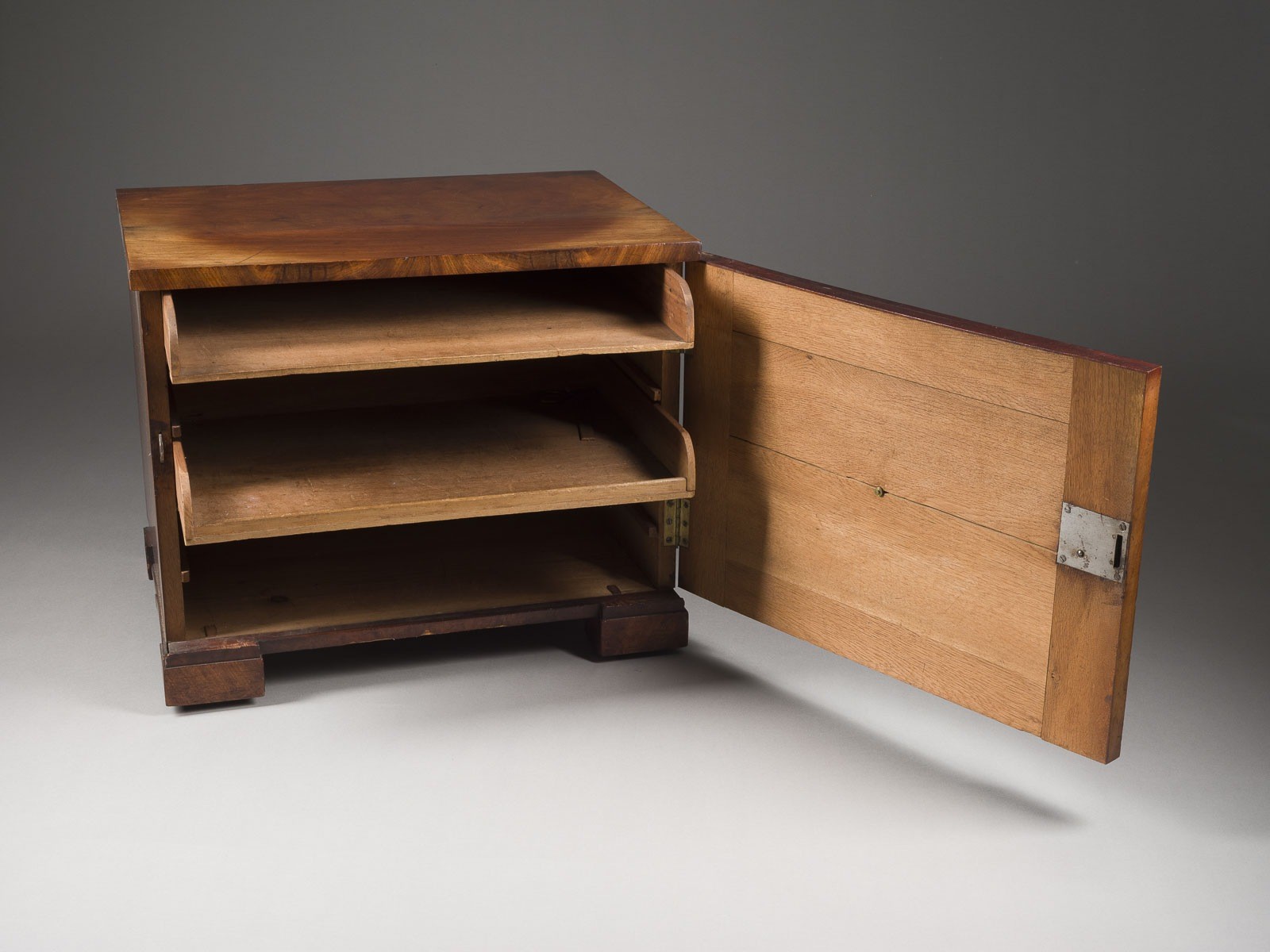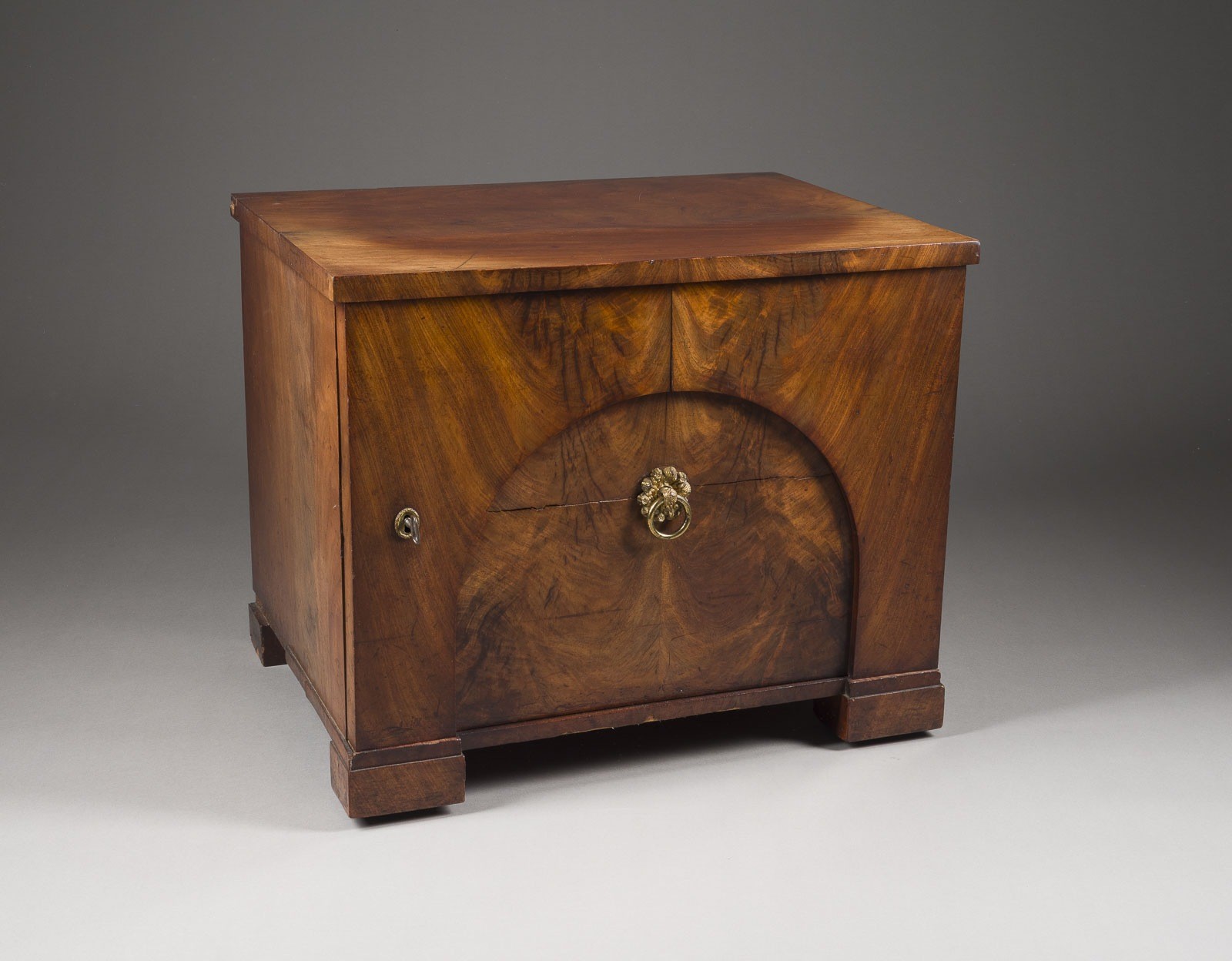 SMALL ARCHED CABINET Berlin, early 19th century Walnut, veneered, arched door, two shelves inside, on casters, original fittings present. H. 51, W. 61, D. 46 cm. Part. bumped.