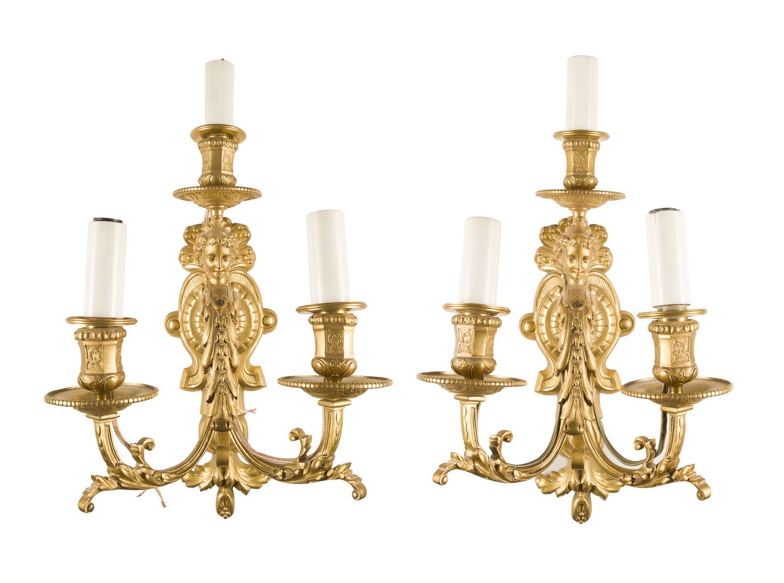 PAIR OF MAGNIFICENT WALL CHANDELIERS 2nd half of the 19th century Bronze, gold plated, electrified. H. 40 cm (without bulb), W. 24 cm, D. 26 cm. three-light each; with floral decoration and mascarons. Part. rubbed; function untested.
