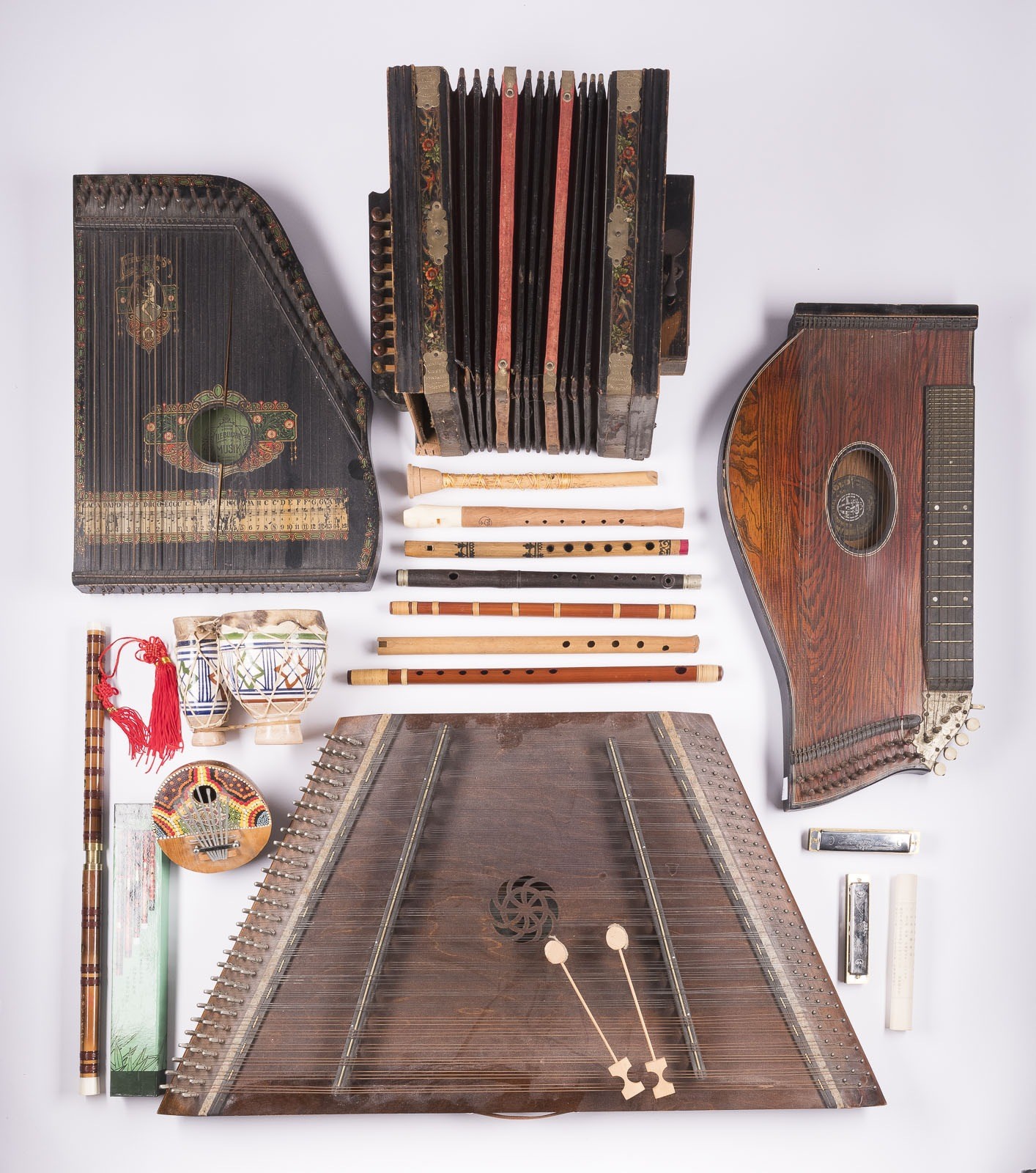 ARGE GROUP OF 16 MUSICAL INSTRUMENTS: ZITHERS, HAMMERED DULCIMER, FLUTES, ACCORDION, HARMONICAS AND KALIMBA Klingenthal and Asia, 19th / 20th century. Wood, metal and leather. Various sizes. Some instruments marked, including a zither with internal label and accordions with metal nameplates. Extensive group of musical instruments of various types and origins. The focus is on folk plucked, struck and wind instruments of the 20th century, complemented by harmonica instruments from Klingenthal production. Including: one accordion by Meinel & Herold, Klingenthal Harmonika Fabrik; one zither "Liebliche Musik" guitar zither; and one zither by Meinel & Herold, Klingenthal. Condition varies, with age- and use-related wear, in part with heavier signs of use; playing condition of the individual instruments not tested.