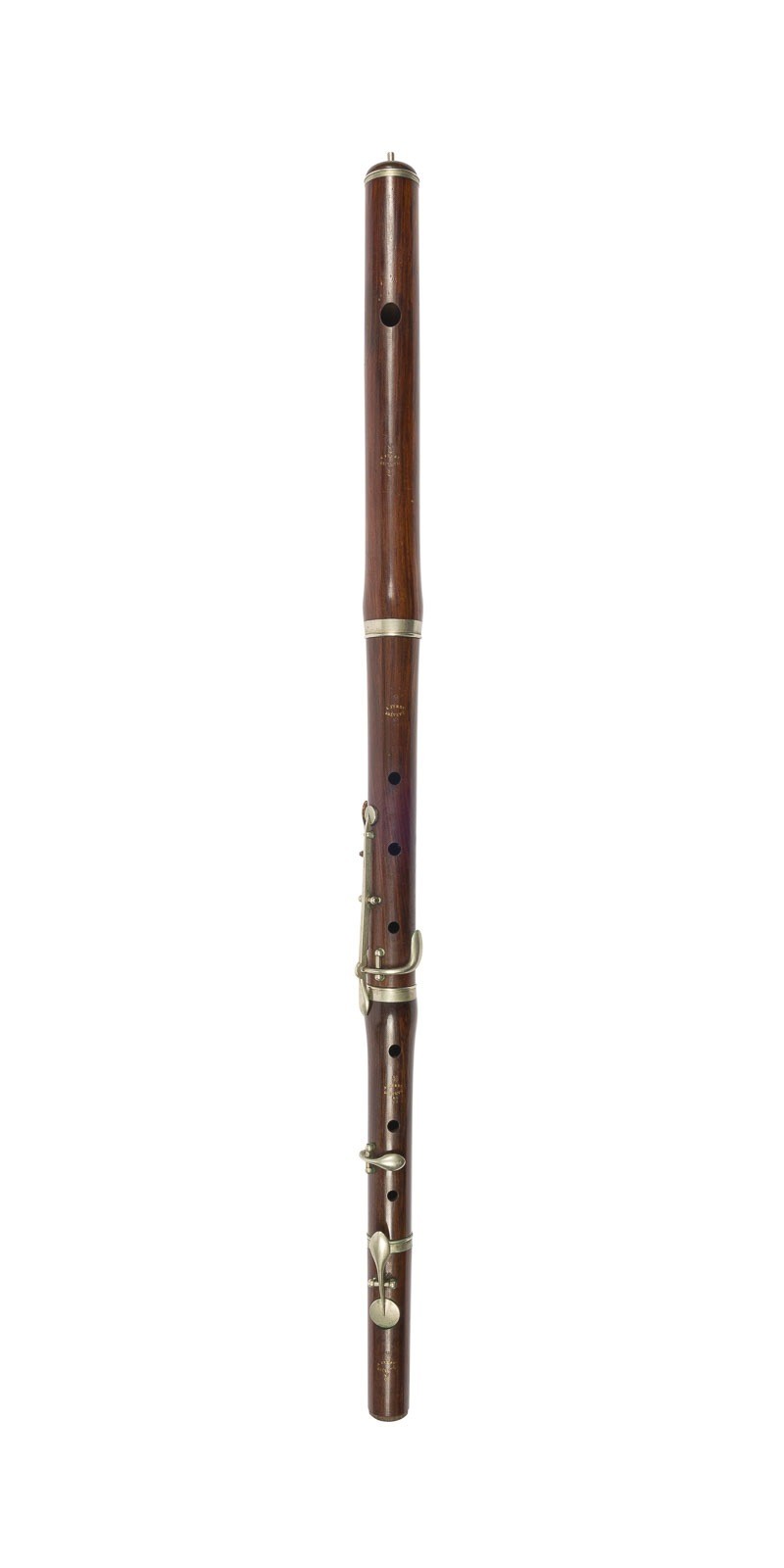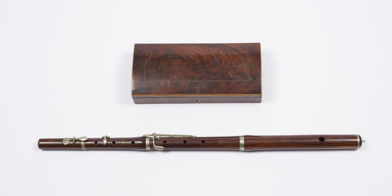 WOODEN TRANSVERSE FLUTE 'ARMAND FERRY BREVETÉ' France, late 19th / early 20th century. Wood, four-piece, with keyed mechanism and metal tenon fittings, in a wooden case. Length 63 cm. Each section marked to the front "A. Ferry Breveté". Damaged and cracked, mouthpiece missing, functionality not tested.
