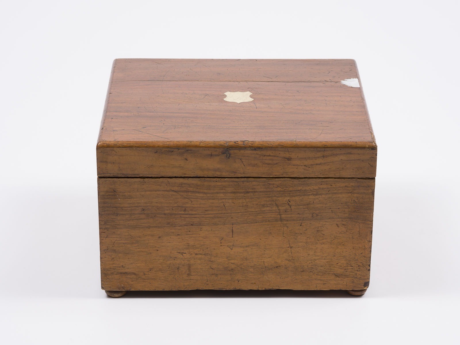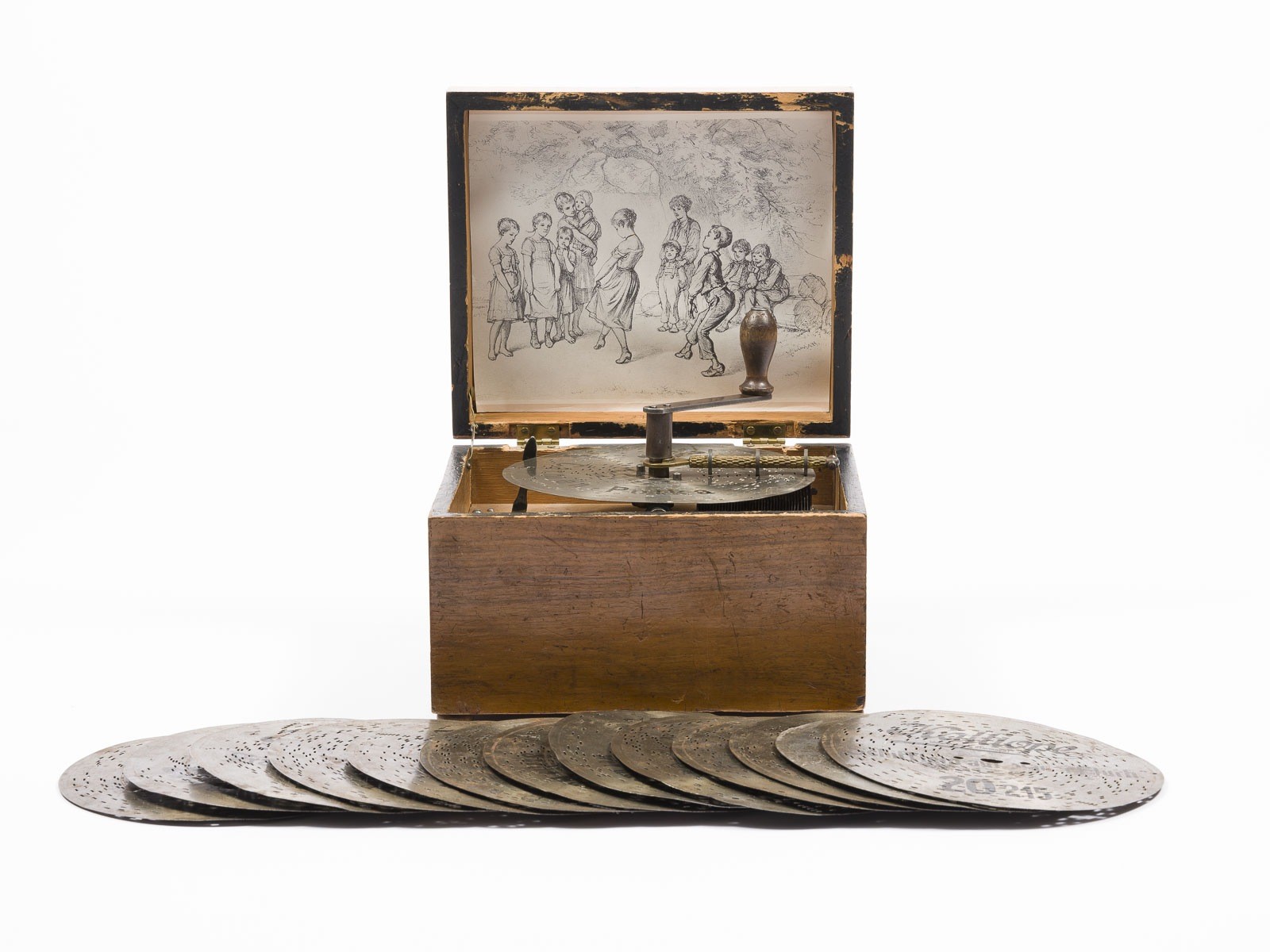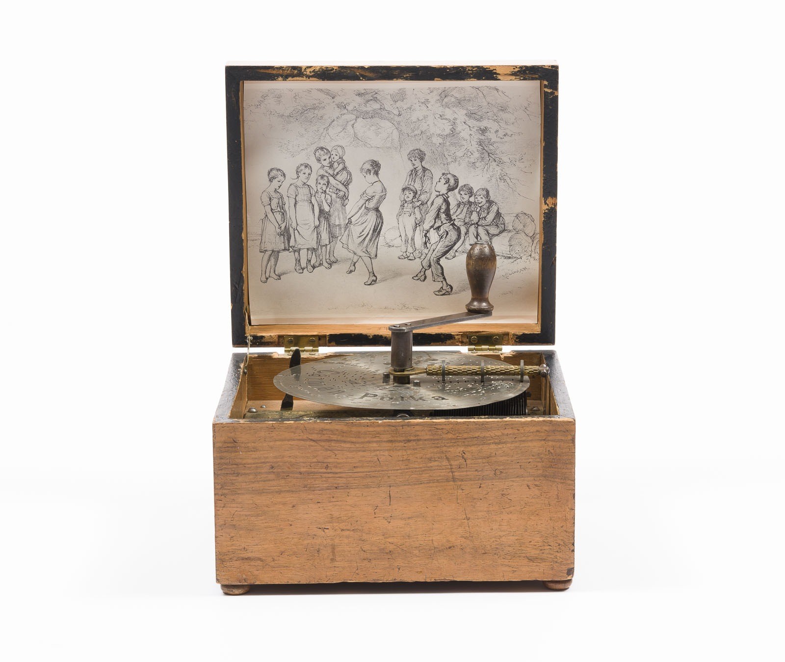 KALLIOPE / PUNCHED MUSIC BOX WITH 14 PLATES Leipzig, circa 1900 Wooden case, veneered, mechanical disc music box with crank drive, metal mechanism, with 14 interchangeable, perforated playing plates, lithograph inside the lid. H. 15, W. 24, D. 21 cm. Inscribed 'Kalliope' on the plate. Partially damaged and shows signs of age-related wear, function tested (plays).