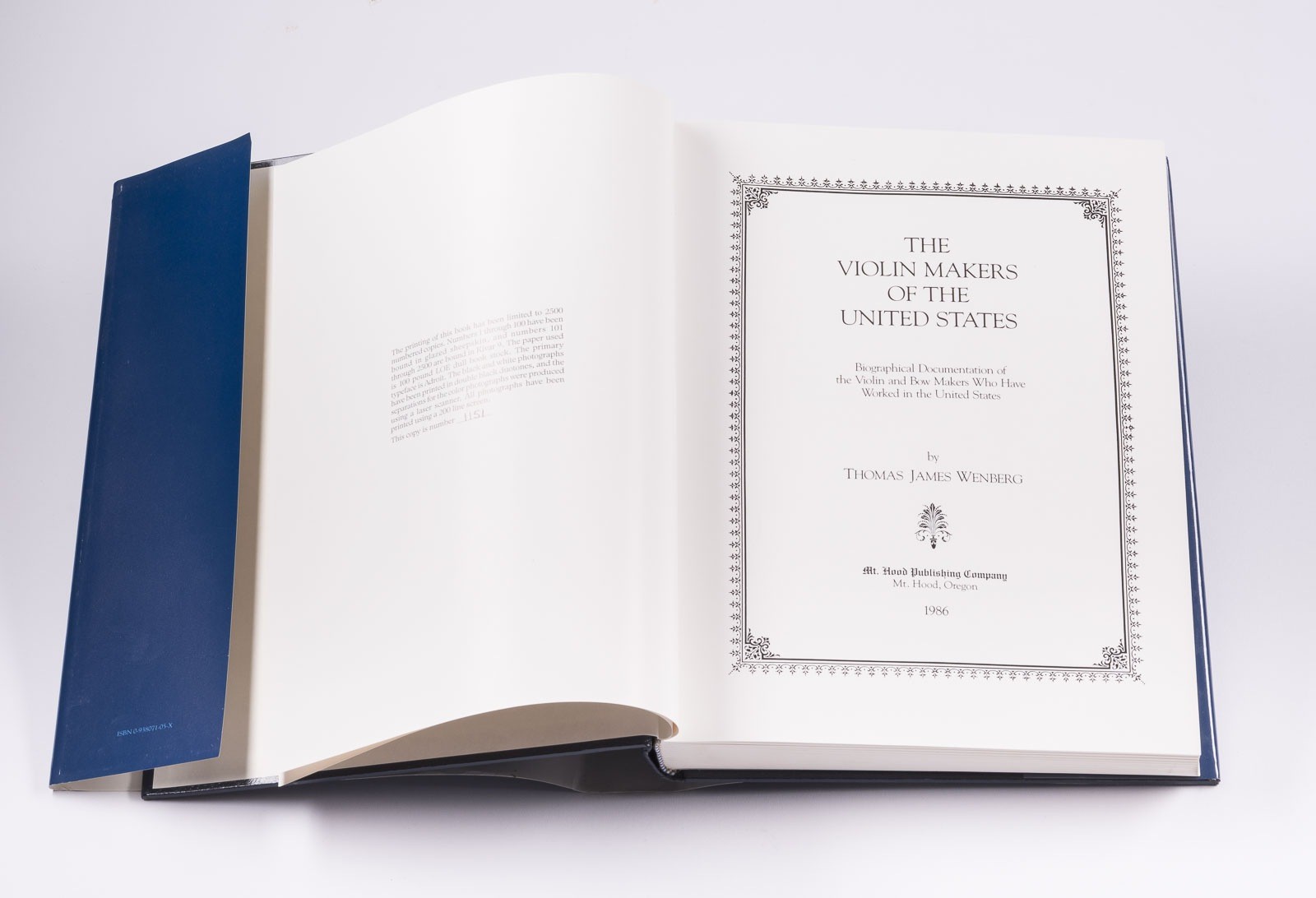 THE VIOLIN MAKERS OF THE UNITED STATES OF AMERICA - WENBERG Oregon, 1986 Hardcover, with numerous illustrations, biographical entries, and details of works. Approx. 28 × 22 cm. Limited edition 1151/2500. Comprehensive standard work on the history of American violin making. Thomas James Wenberg systematically documents violin makers working in the United States from the 19th century to the present day, presenting their biographies, workshops, and stylistic characteristics. The work offers a detailed overview of regional schools, immigrant influence, and the development of an independent American violin-making tradition. To this day, the book is considered an authoritative reference for collectors, dealers, violin makers, and experts in the international stringed instrument market. Signs of wear.
