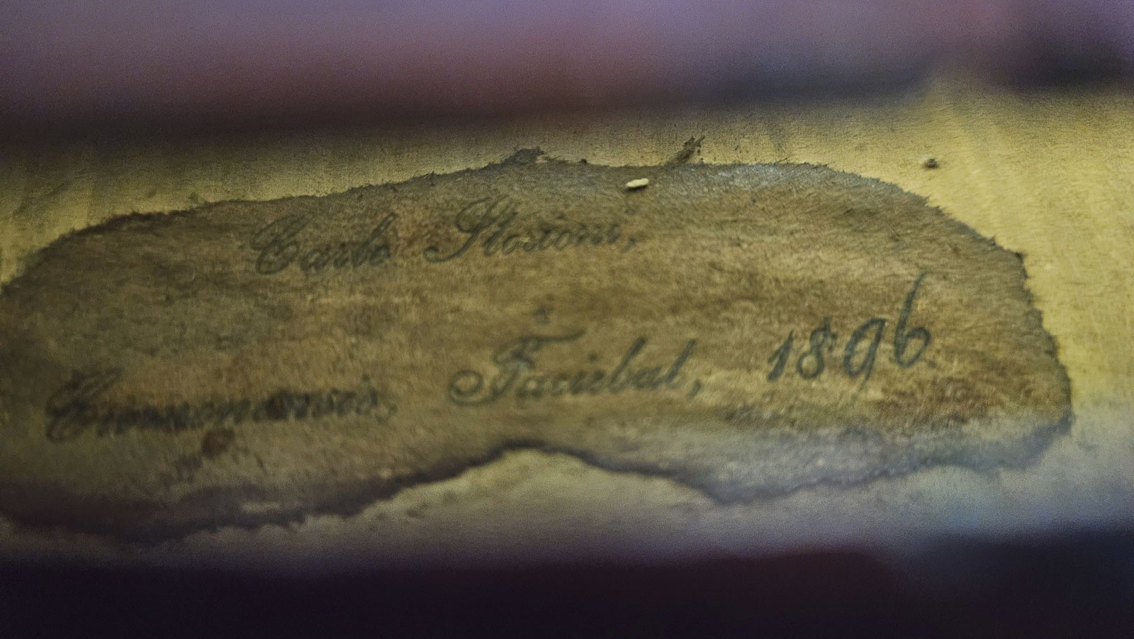 VIOLIN LABELLED 'CARLO STORIONI' Probably German, 1896. Two-piece spruce top and maple back, brown varnish. Full-size (4/4) violin, length 59.1 cm, body length 35.5 cm. Labelled "Carlo Storioni Cremonensis facebiat 1896". Bumped. Provenance:** Private collection, Austria.
