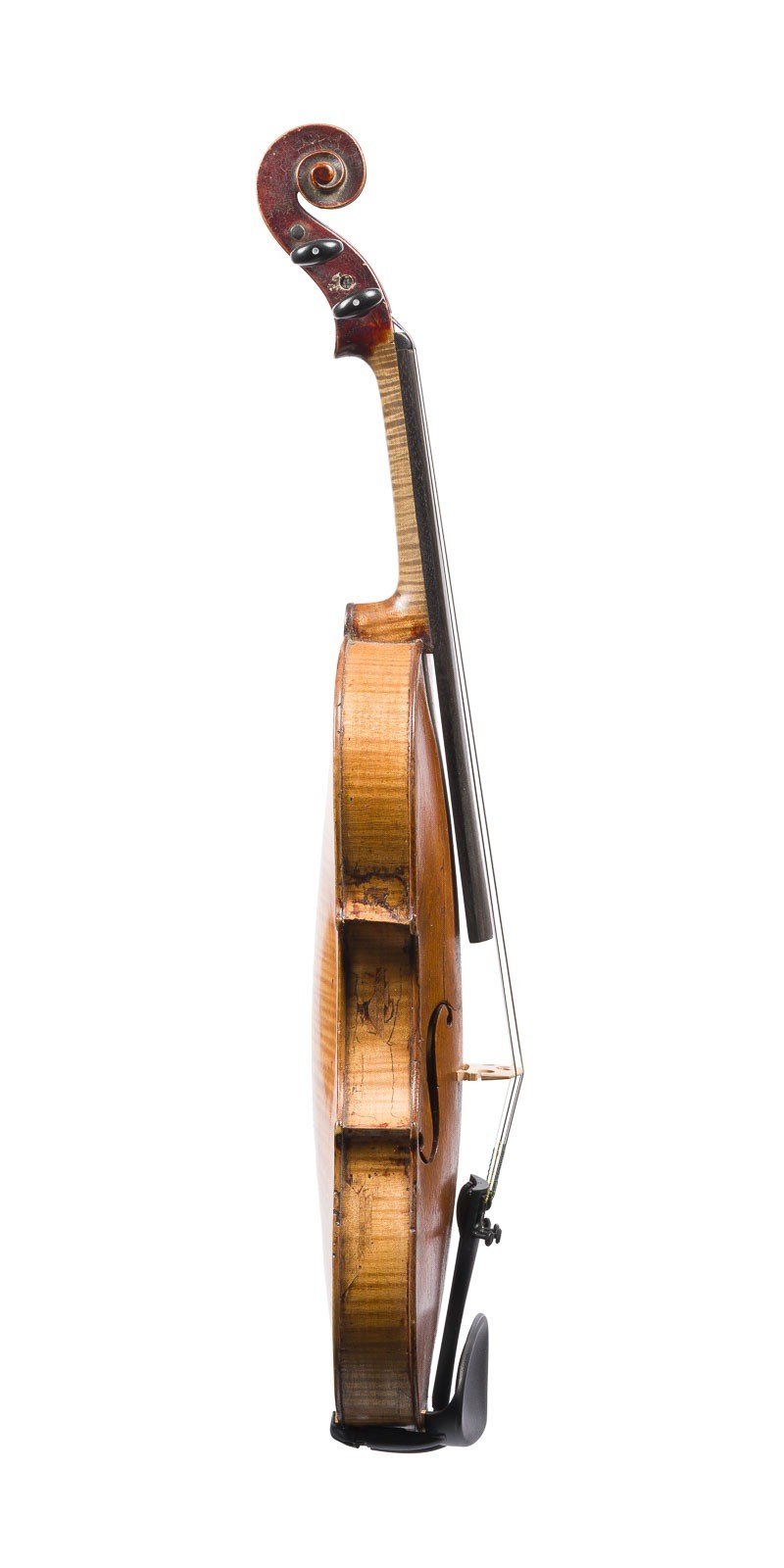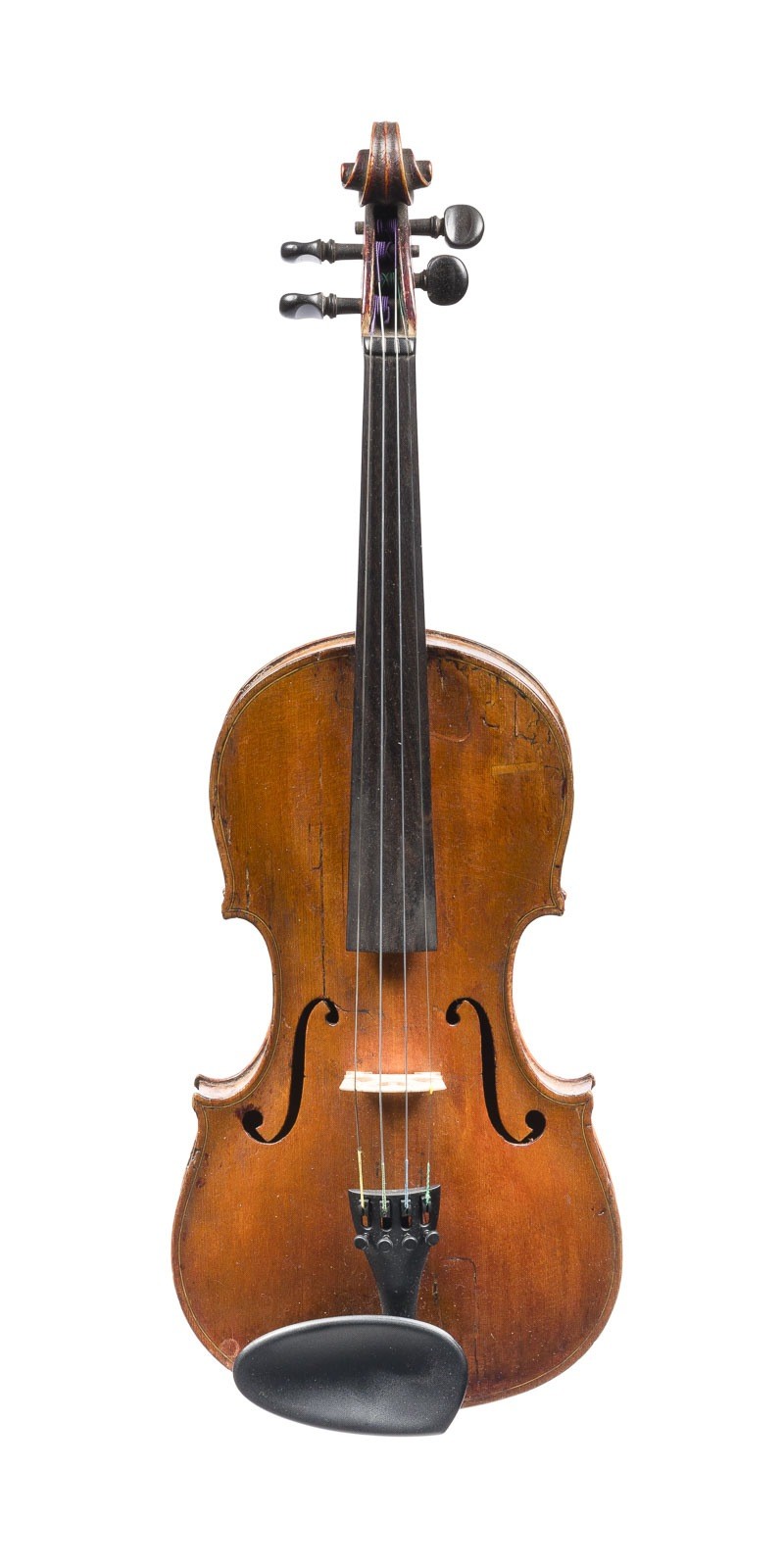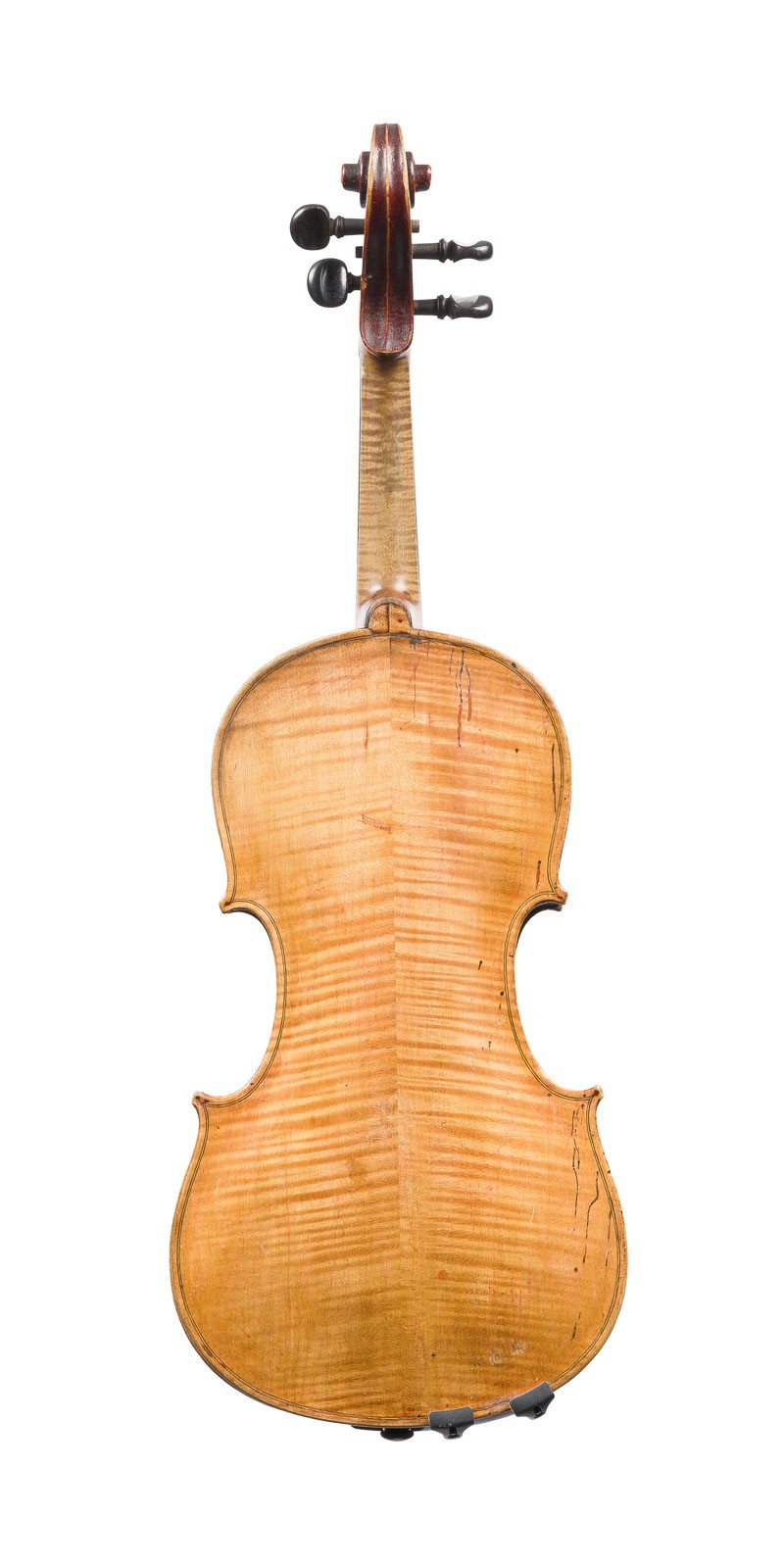 VIOLIN BY 'MATTHIAS NEUNER' AND TWO VIOLIN BOWS* Probably Mittenwald, 19th century. Two-piece spruce top and maple back, light brown varnish, with case. 4/4 violin, length 59 cm, body length 36 cm. Violin label: 'Mathias Neuner violin maker in Mittenwald 1801 No. 94'. Two violin bows, German, early 20th century, round and octagonal stick, simple and Parisian eye, winding, thumb leather, 1x bone and 1x ivory head palte, partially bumped. Violin partially bumped and cracks in the top, top, back, and sides, rest. Expertise: Restoration by Hans-Josef Thomas, Aachen, 2025. Provenance: Private collection Aachen.