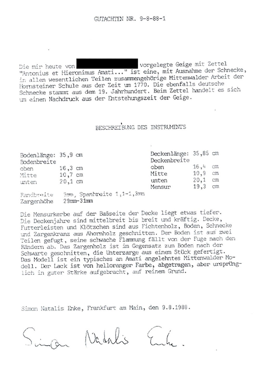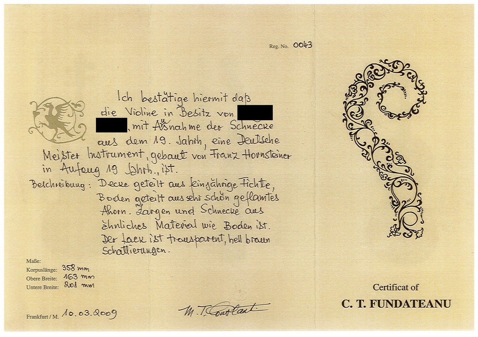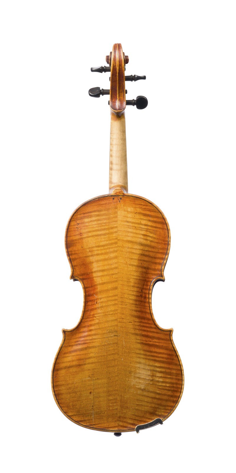 VIOLIN FRANZ HORNSTEINER SCHOOL AFTER AMATI Mittenwald, around 1770 Two-piece spruce top and flamed maple back, dark brown-orange varnish, with case, scroll later (19th century). 4/4 violin, l. 59,4, body length 35,8 cm. Partly dam. and rubbed, cracks to top and back, dam. to neck. Expertise: Expertise Enke, Frankfurt am Main, 1988 and certificate C. T. Fundateanu, Frankfurt, 2009. Provenance: From an old private collection in Hesse.