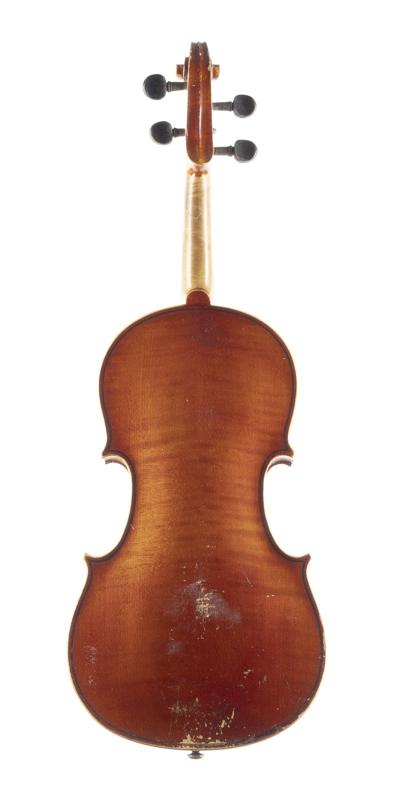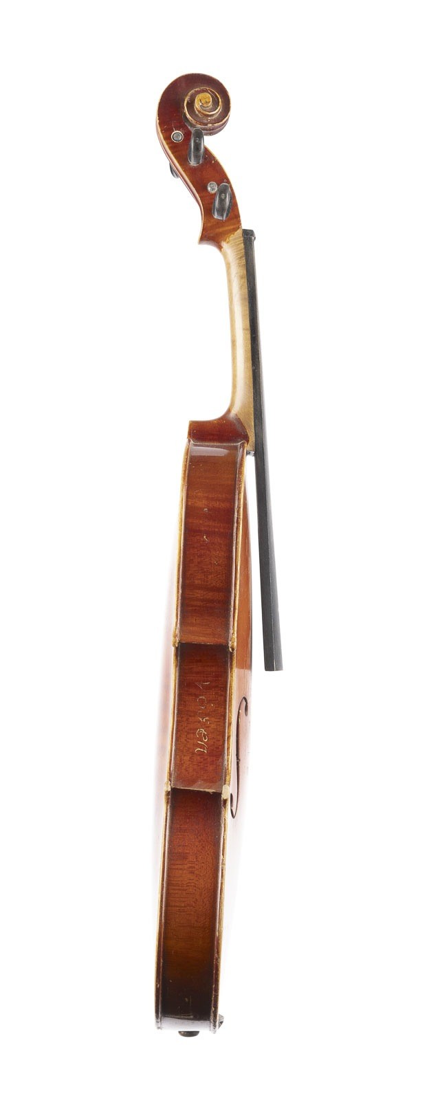VIOLIN AFTER ANTONIO STRADIVARI Bohemia/Saxony, 19th/20th century. Two-piece spruce top and flamed maple back, dark brown varnish, double purfling. 4/4 violin, l. 59.9 cm, body l. 36 cm. Marked 'Vosen' on the side and violin label: 'Antonius Stradivarius Cremonensis Faciebat Anno 1704 A.S. Made in Germany'. Bumped and rubbed, rests and damage to neck.
