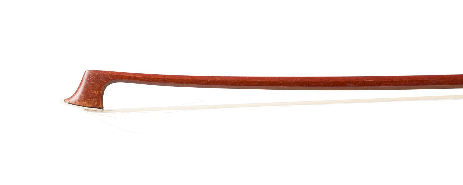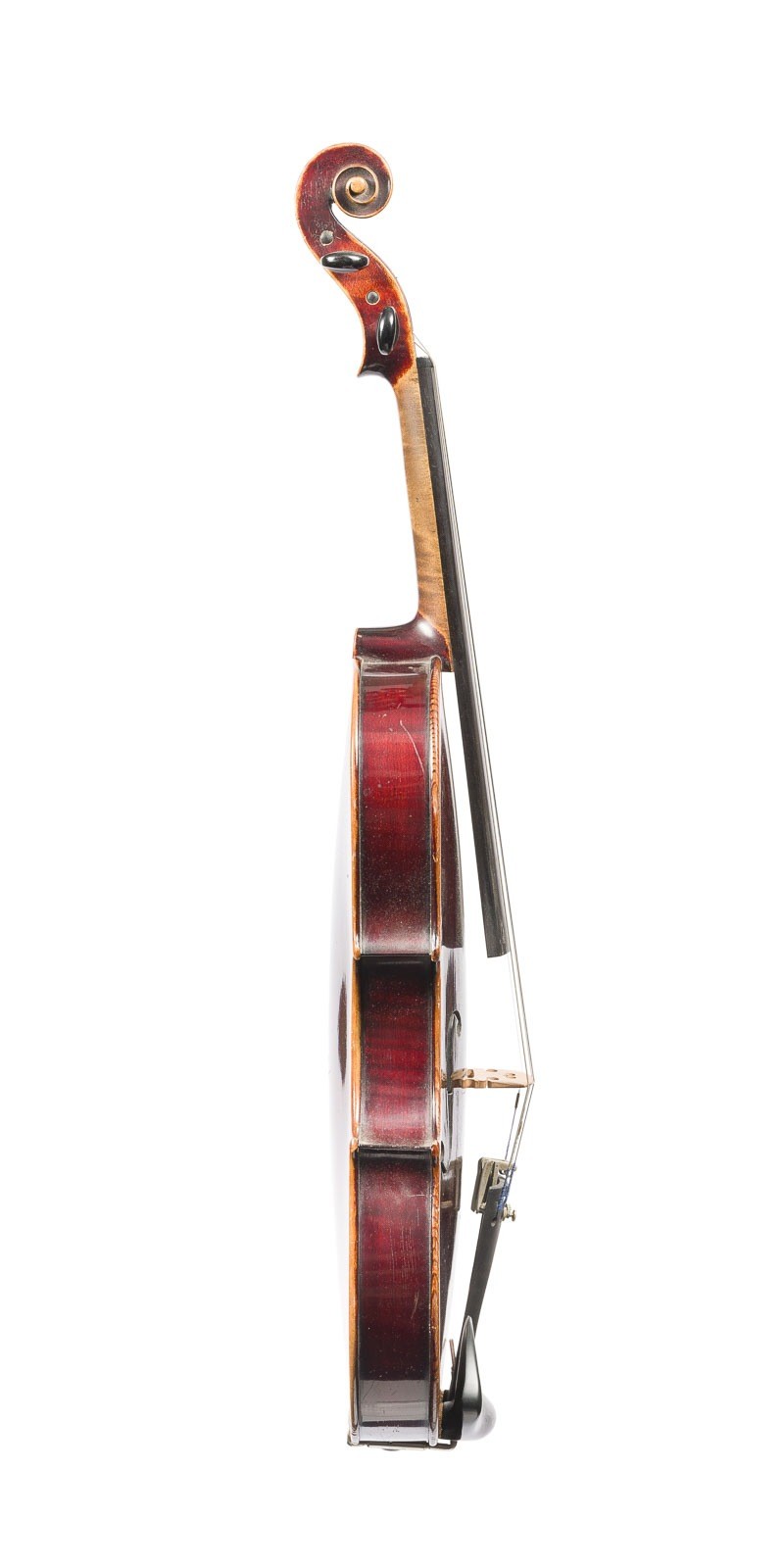 VIOLIN 'WILHELM HERWIG' AND VIOLIN BOW 'DESZO HORVÁTH' Markneukirchen, early 20th century. Two-piece spruce top and maple back, dark red-brown varnish, with case. 4/4 violin, length 58.5 cm, body length 35.5 cm. Violin label: 'Wilhelm Herwig in Markneukirchen'. 4/4 violin bow, Bubenreuth, 20th century, octagonal stick, nickel silver fittings, Parisian eye, winding, thumb leather, plastic frog, L. 74 cm, partly bumped, one eye damaged. Violin partly bumped, rest. Provenance: Private collection Hesse.