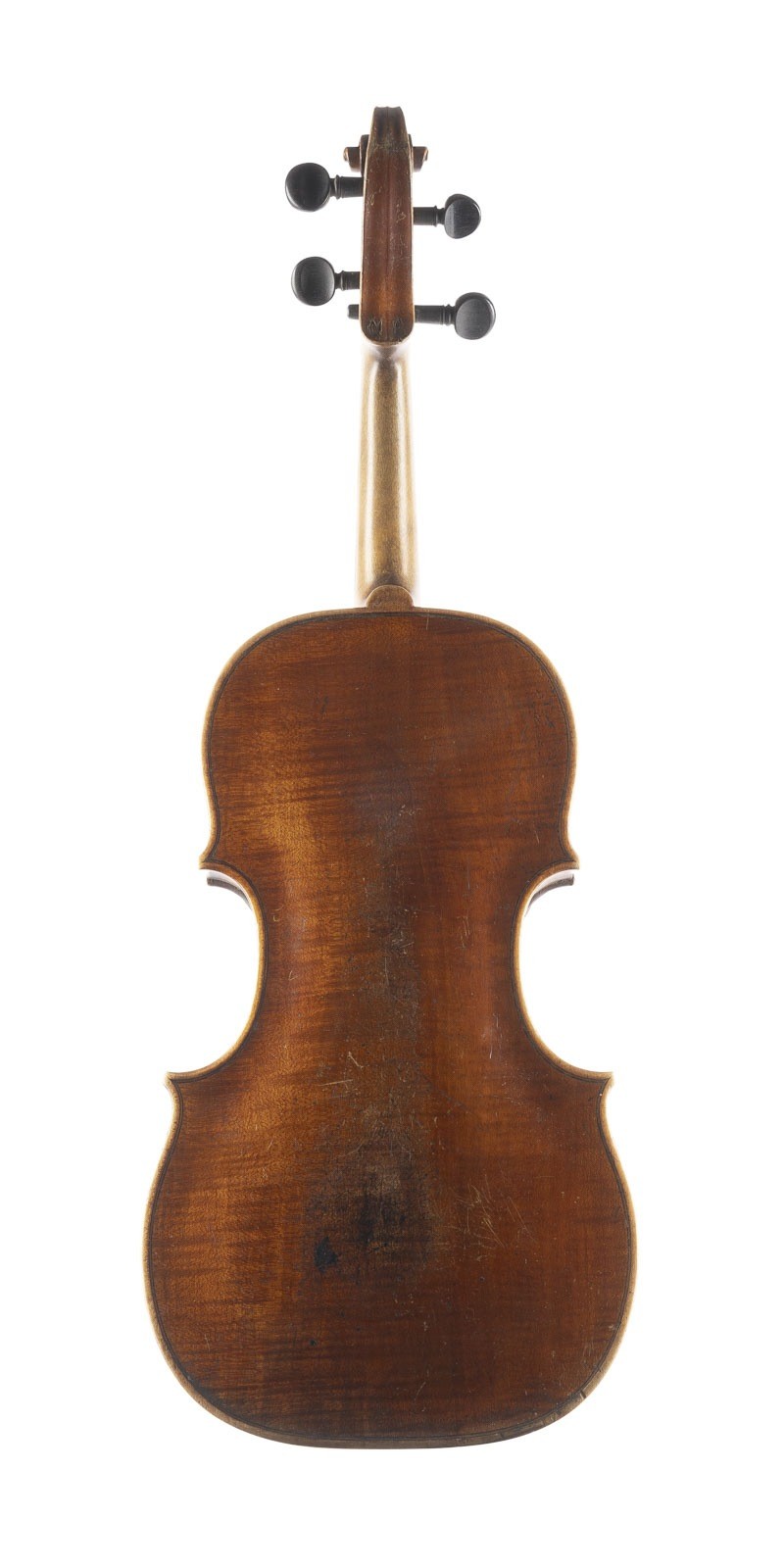 VIOLIN PROBABLY CASPAR HOPF Probably Klingenthal, 19th century. Two-piece spruce top and one-piece lightly flamed maple back, brown varnish. 4/4 violin, l. 59 cm, body length 35.4 cm. Without violin label. With original Jäger case. Bumped and rubbed, without strings, bridge, tailpiece, min. cracks to the lower top.