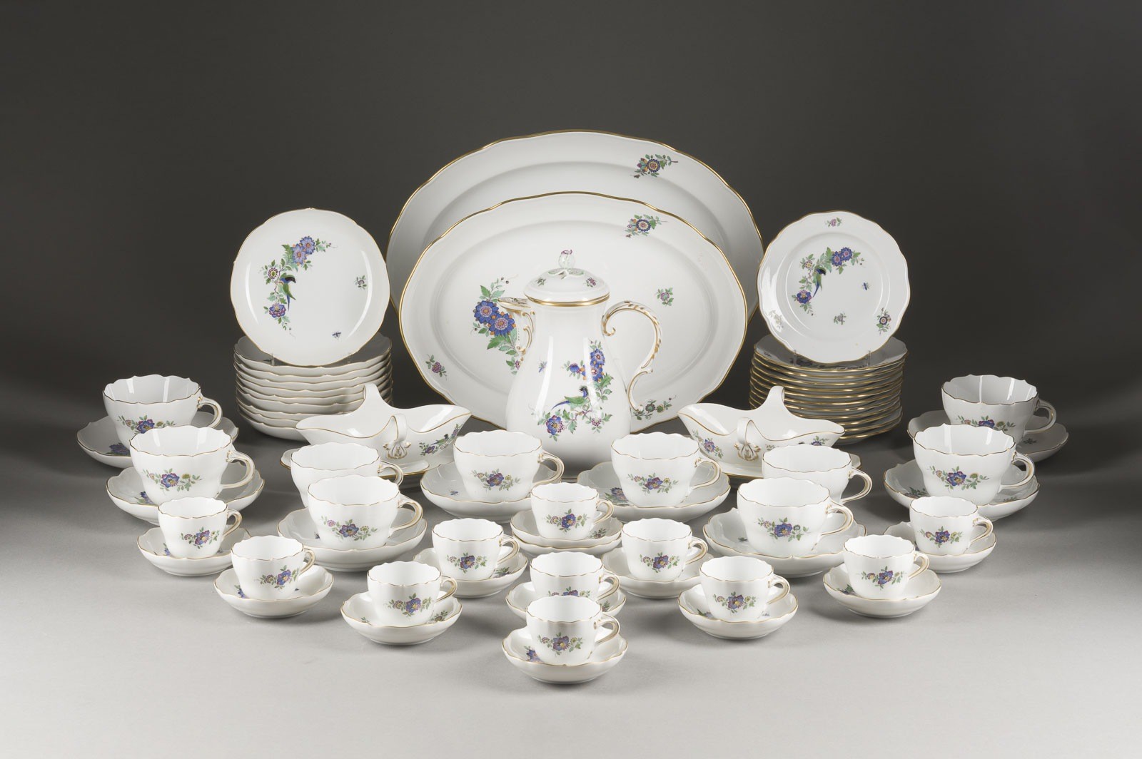 Porzellan, polychrome Malerei, Goldstaffage. D. 32,5 cm (Kuchenplatte). Unterglasurblaue Schwertermarke, Press- und Malernummer, part. Modellnr. Bestehend aus: 1 Kuchenplatte, 1 Schale, 2 Terinnen, 1 Vase, 1 Kaffeekanne, 2 ovl.