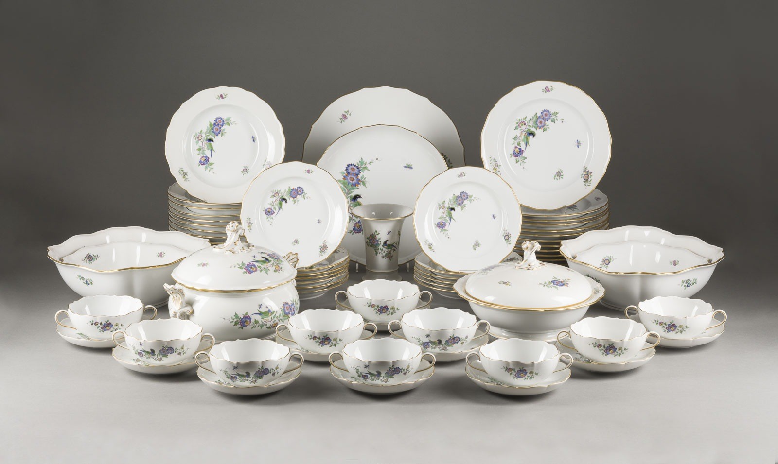 Untertassen, 13 Kuchentellern, 12 Suppentellern, 12 Speisetellern, 4 Schüsseln, 2