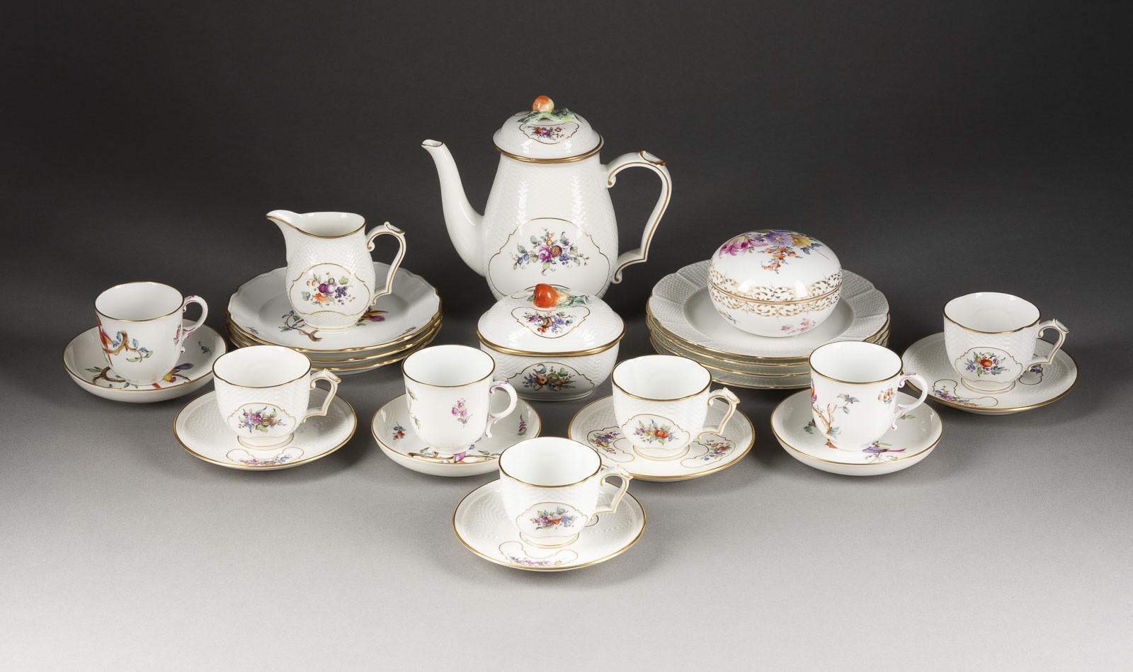 Porzellan, polychrome Malerei, Goldstaffage. H. 19,5 cm (Kanne), D. 12,5-13,5 cm (Untertasse),. Part. eingepresstes Rautenschild, Grüner Manufakturstempel, einmal blaue Schildmarke (1895 bis 1910). Bestehend aus: 1 Kaffeekanne, 1 Milchkännchen, 1 Zuckerdose, 7 Kaffeetassen mit 7