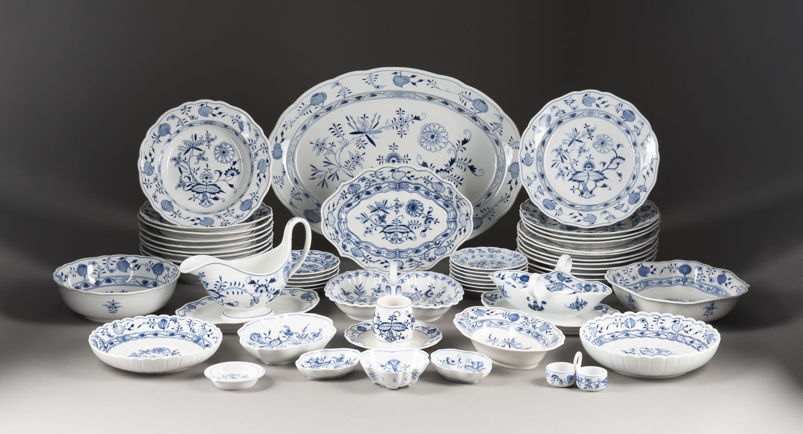 Porzellan, Blaumalerei. L. 48 cm (Platte). Unterglasurblaue Schwertermarke ( teilw. Knaufschwerter), Press- und Malernummer. Bestehend aus: 1 Platte, 11 Speisetellern, 12 Brottellern, 9 Suppentellern, 2 Saucieren, 4
