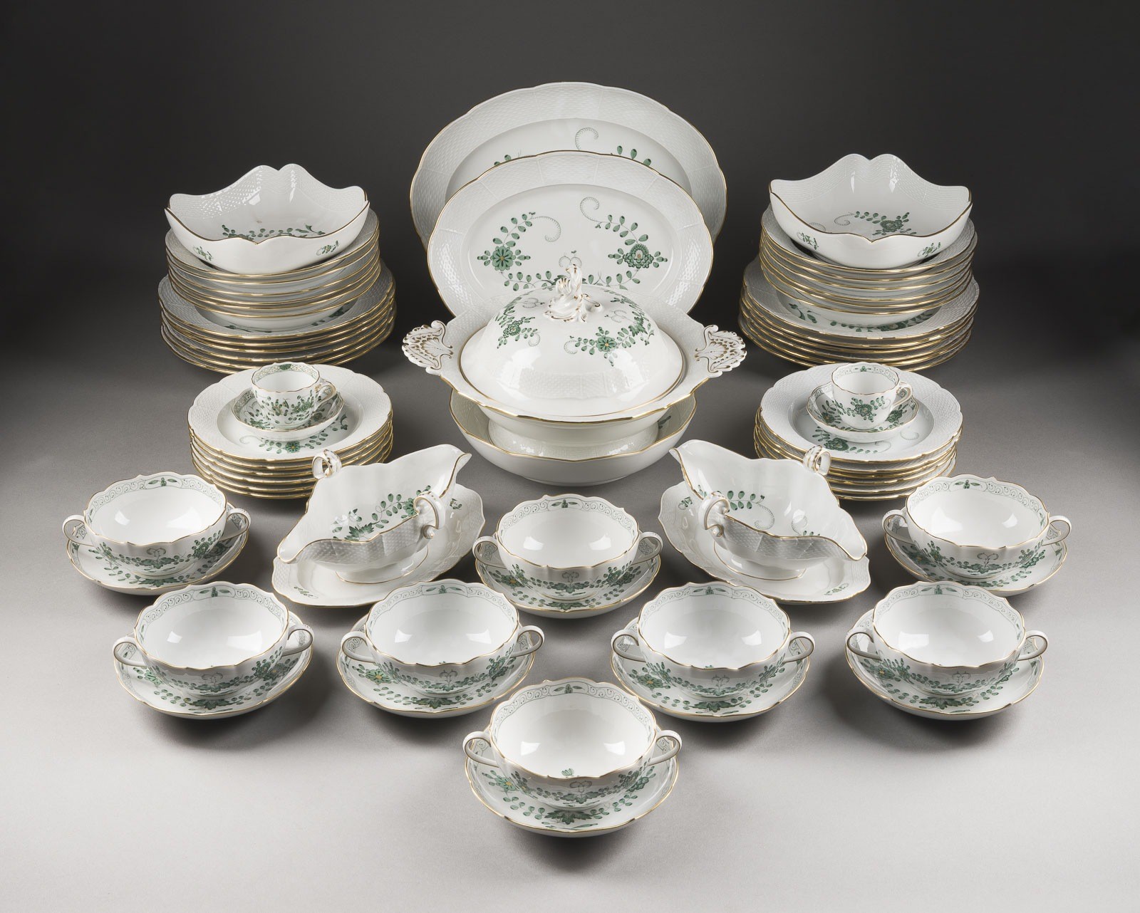 Porzellan, Camaieumalerei in Grün, dezente Goldstaffage. L. 30,5-35,5 cm (Platte), D. 25 cm (Schale). Unterglasurblaue Schwertermarke, part. Press- und Malernummer, Modellnr. Bestehend aus: 1 Suppenterrine, 2 Saucieren mit Tellern, 2 eckigen Schalen, 12